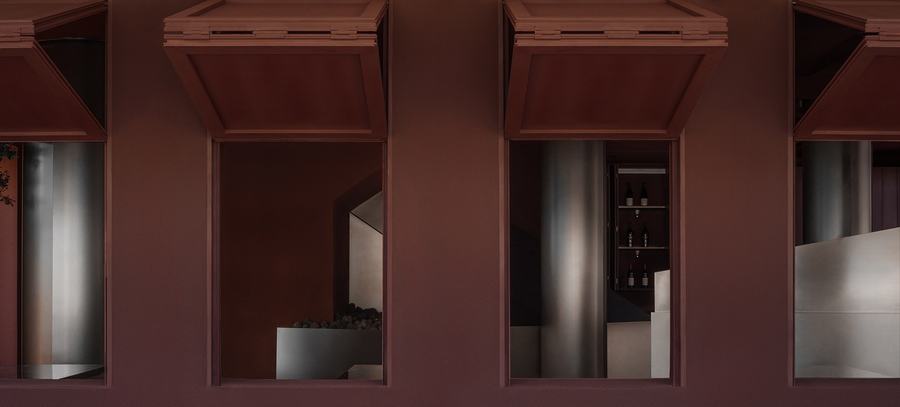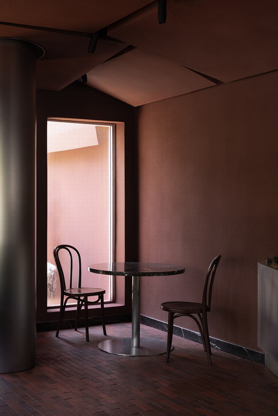 选用不同颜色的手工烧制砖混合铺在地面上。这种有意的“老化”,让一个新餐厅从氛围的角度迅速沉淀下来,并留下一点时间的印记。巨大的玻璃幕墙让自然光进入室内,最大限度地扩大视野,与自然产生共鸣感。