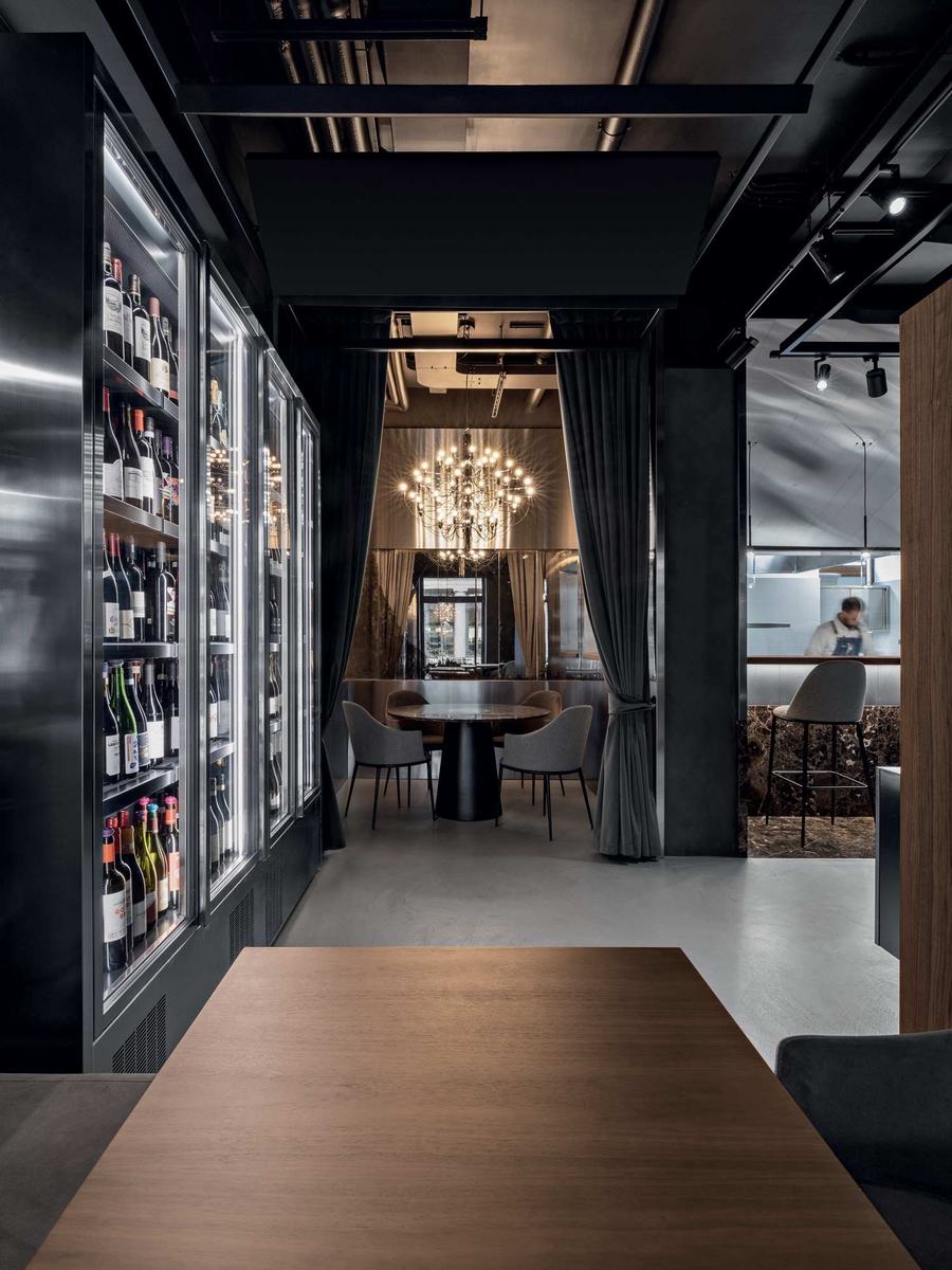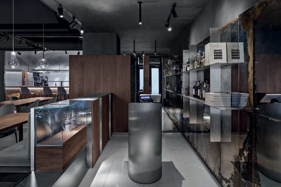 Scatto餐厅的设计灵感源自摄影艺术,建筑概念围绕着视觉锥体展开。这一概念主要由倾斜的钢板表示,将视线引导到空间的焦点——开放式厨房。除了视觉上的引导,光影效果也是整个设计的重要组成部分。悬挂的灯和几乎难以察觉的聚光灯平衡了最暴露的区域与更私密的区域的展示,在空间感知中起着至关重要的作用。这种光影的效果也由使用的反光材料提供,如钢铁和镜面玻璃,与不透明的材料如大理石和木材形成对比,营造出独特的视觉体验。