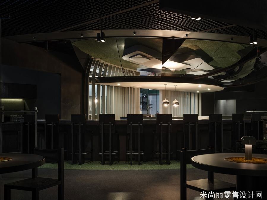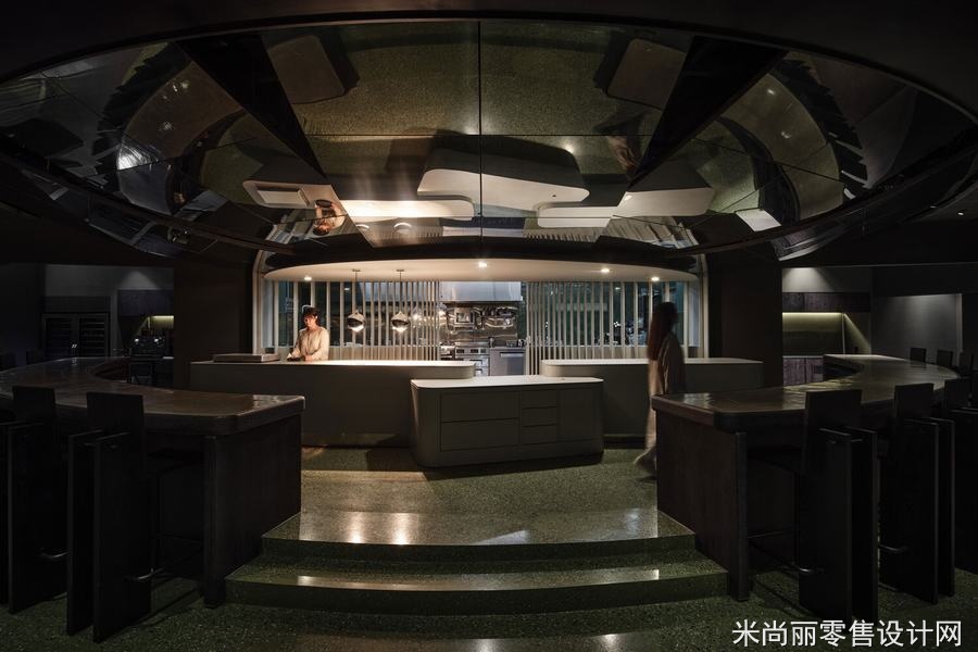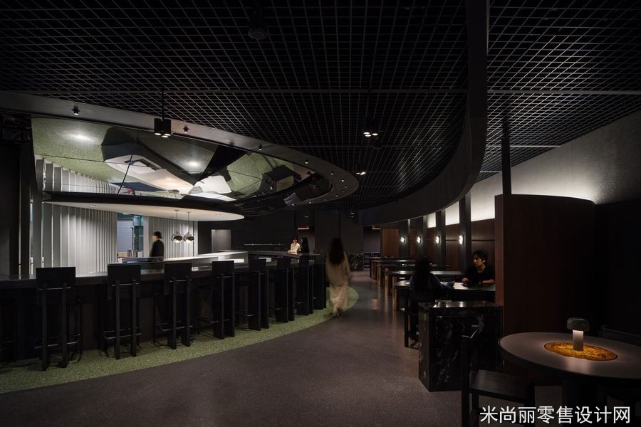 在Confier内部,体验就像进入剧院一样展开,在舞台上移动,并与空间交流。沿着黑暗的走廊,有一个独特的接待处(后台),面对着窗帘之外熙熙攘攘的主舞台,一个前厨房和开放式厨房(主舞台),顾客可以在这里交流和享受,桌子(礼堂)的设计灵感来自剧院观众的布局。特别是,安装在前厨房上方的镜子结构,由于精确规划的反射角,可以从任何位置看到最终的电镀场景。