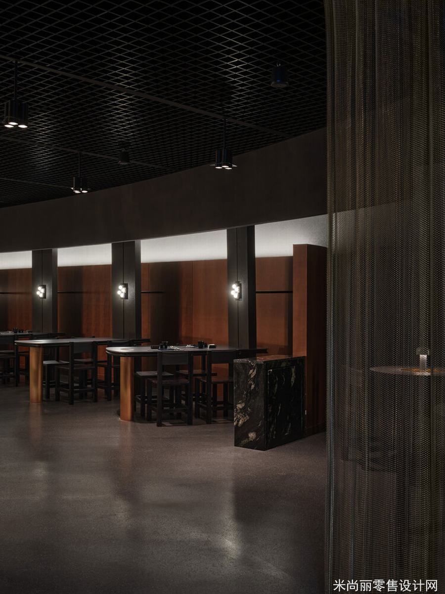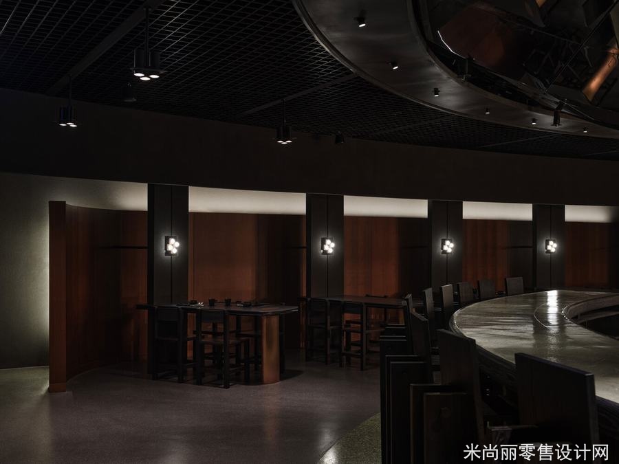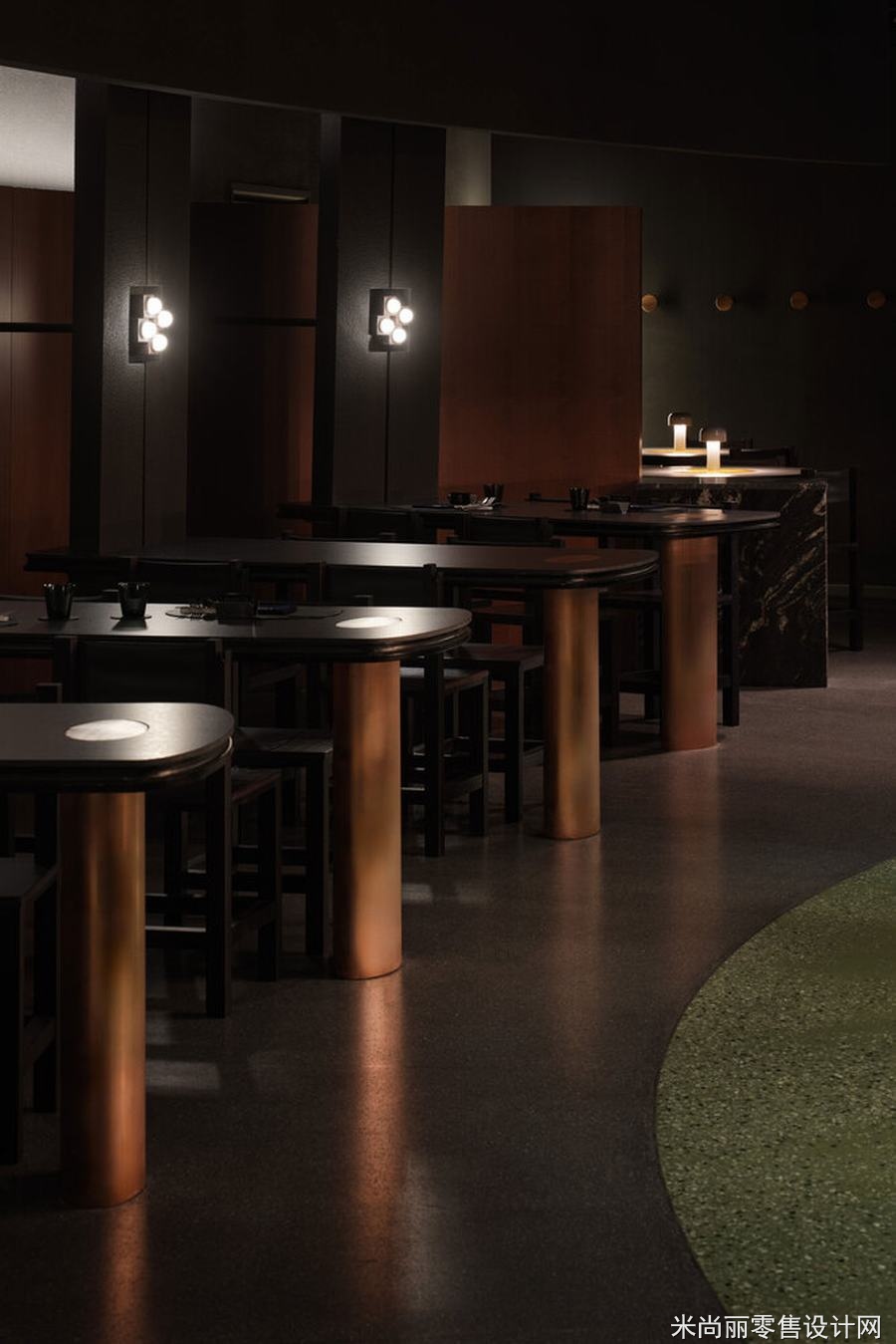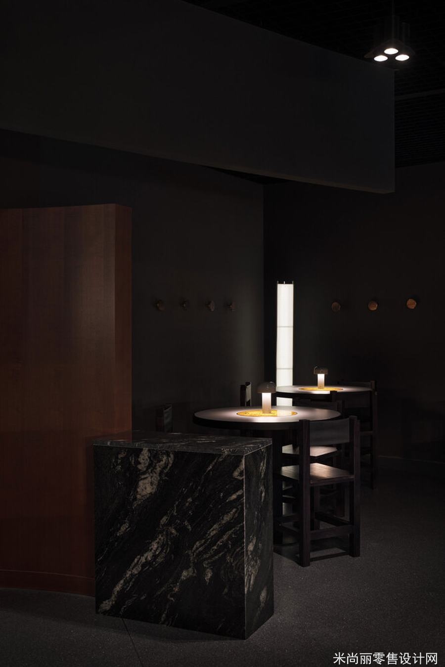 虽然空间的整体色调倾向于黑暗和忧郁,但不同区域的不同饰面刺激了味蕾,在舞台般的环境中与“美食”的主题保持一致。从屋漆、石灰华、大理石、红铜到传统的韩国毛笔绘画(chilbo),不同的饰面都贡献了独特的色调,成为整个空间的重点。