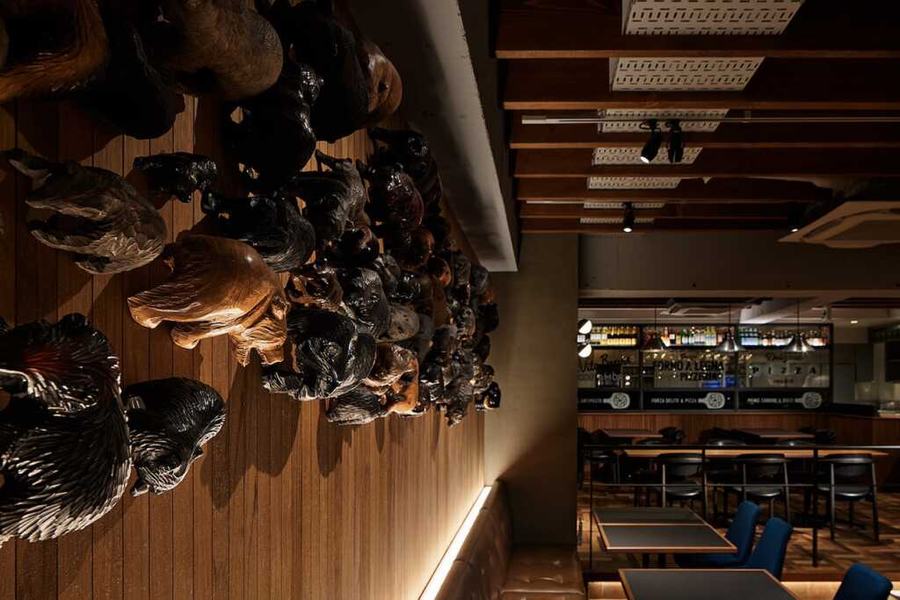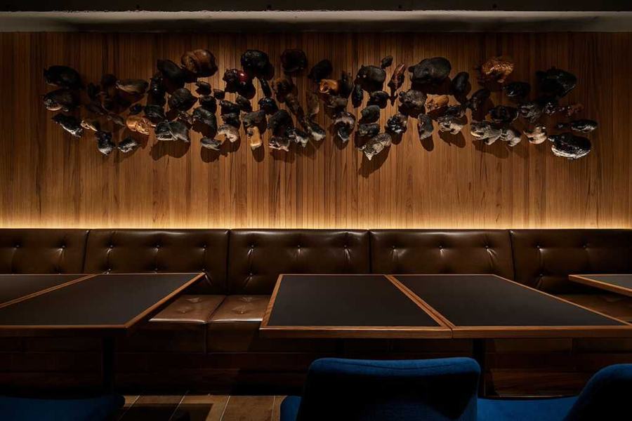 店内的匠心照明全部由原创设计制作而成,营造出温馨舒适的用餐氛围。古董木雕的熊作为墙面展示,大量垂直安装在墙壁上,形成一幅幅独特的画面,仿佛从不同角度俯瞰成群结队的熊横过马路,营造出不可思议的空气感。