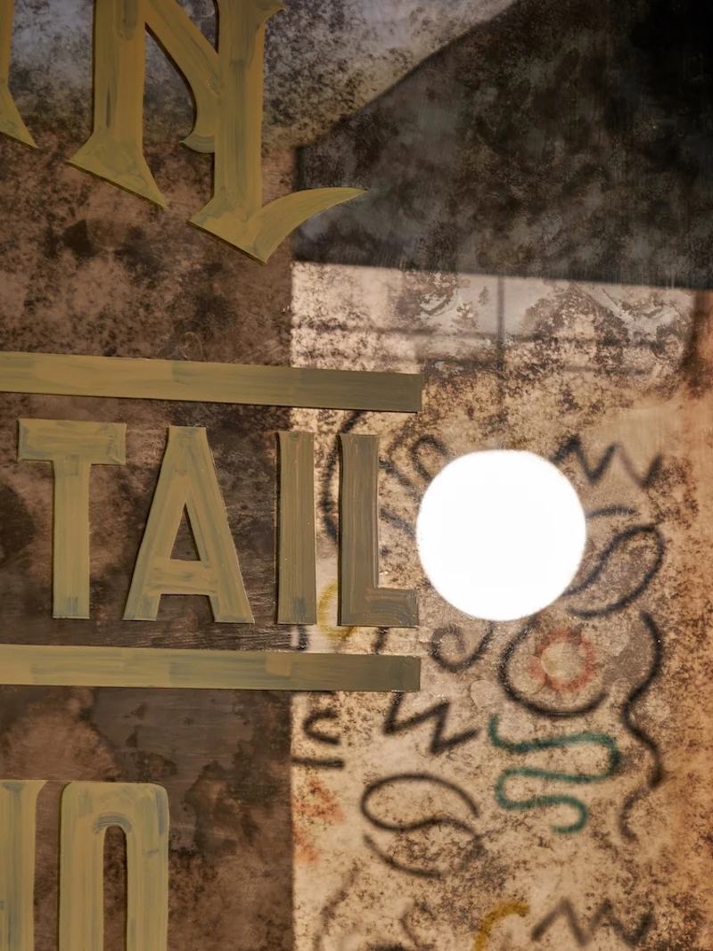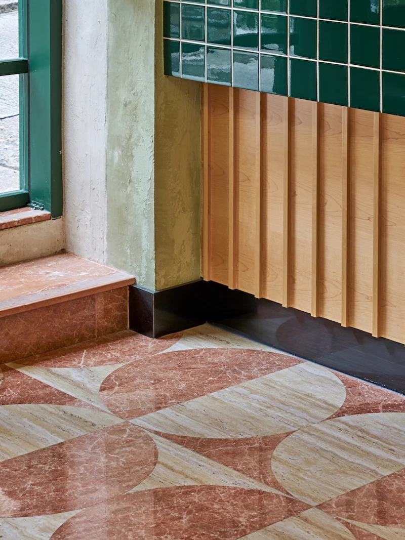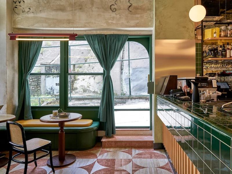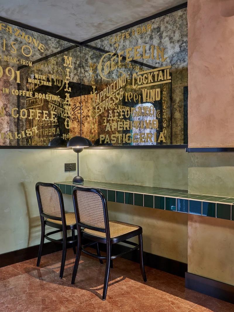 柜台高度的咖啡和鸡尾酒吧以其深绿色瓷砖和古董孟菲斯风格的镜子标志着场地的中心。古色古香的饰面通过反射在视觉上延伸了空间,不仅反映了意大利的复古气息,也反映了顾客本身。