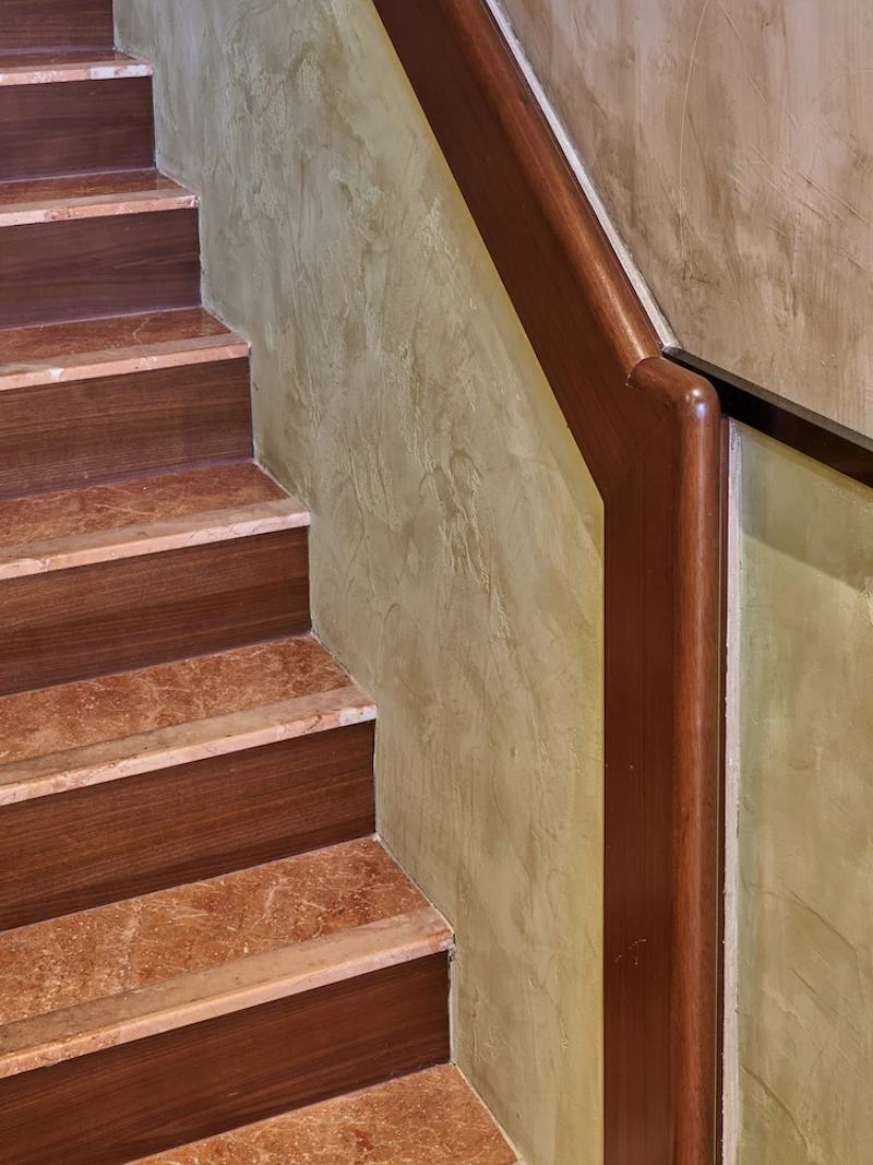 沿着向米兰 20 年代和 30 年代流行的室内设计的楼梯,场地提供了一个私密的私人房间,里面有更多的壁画和舒适的座椅,以及特别是在鸡尾酒期间增加隐私感的窗帘。