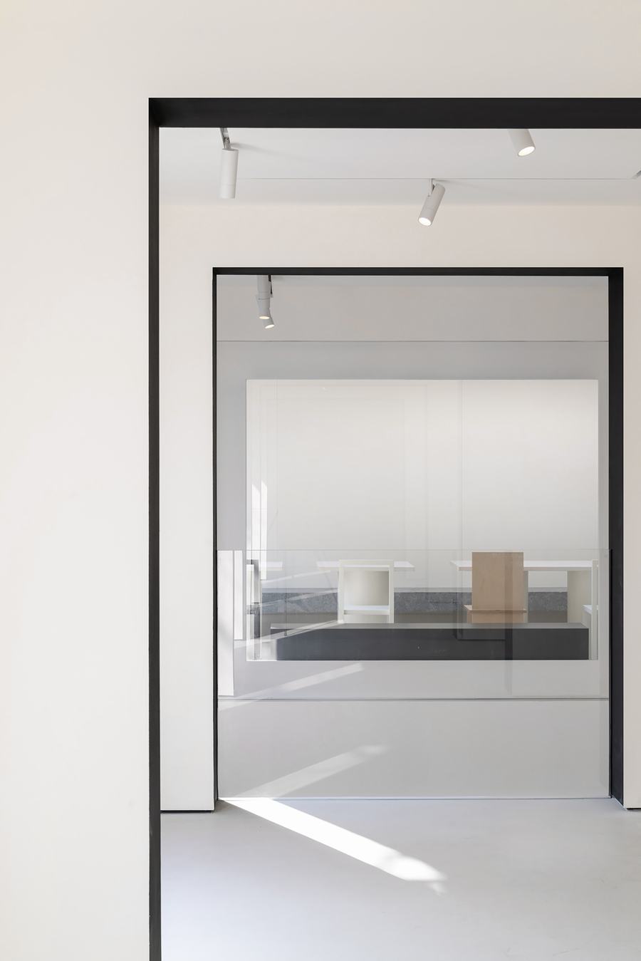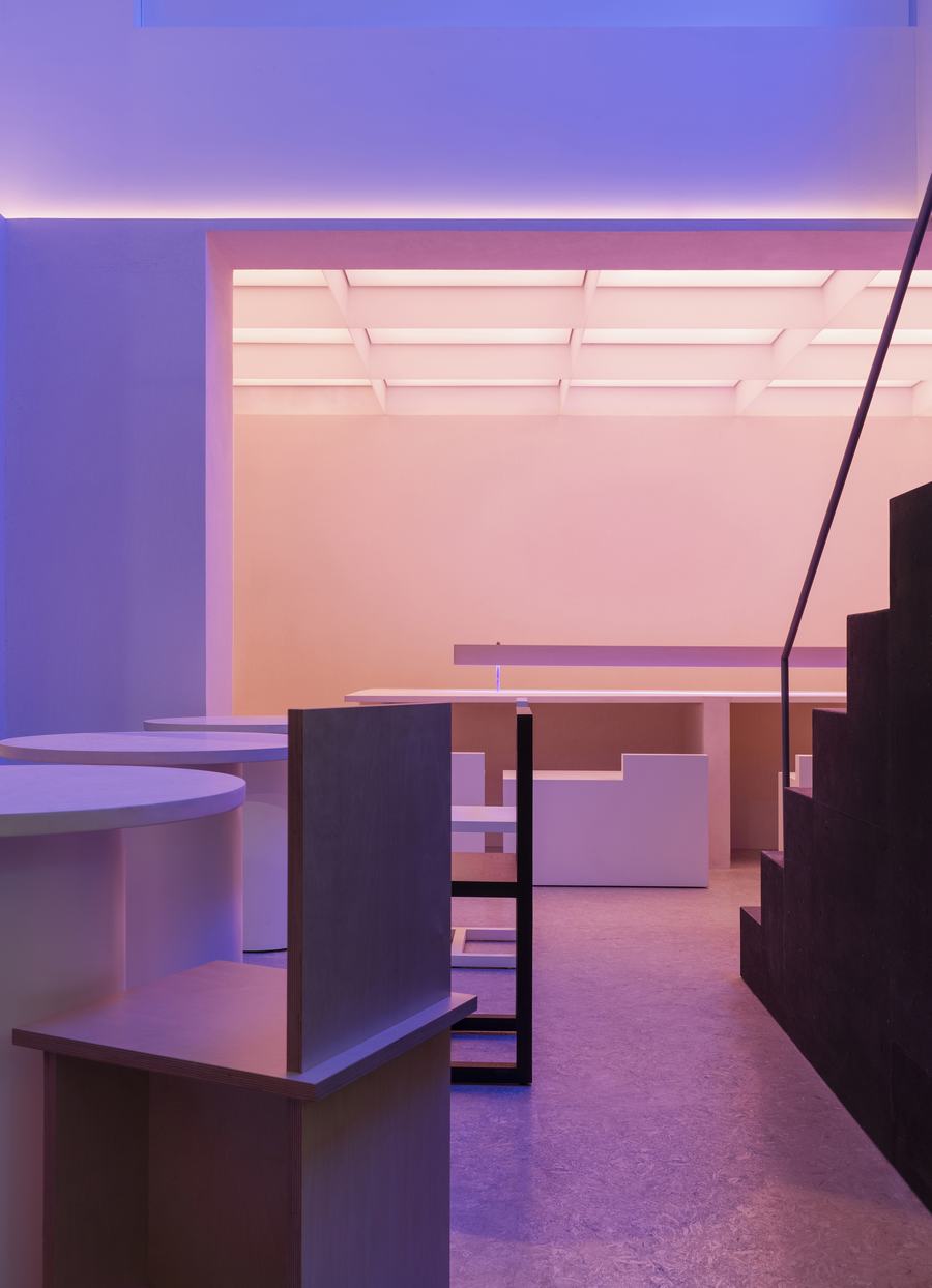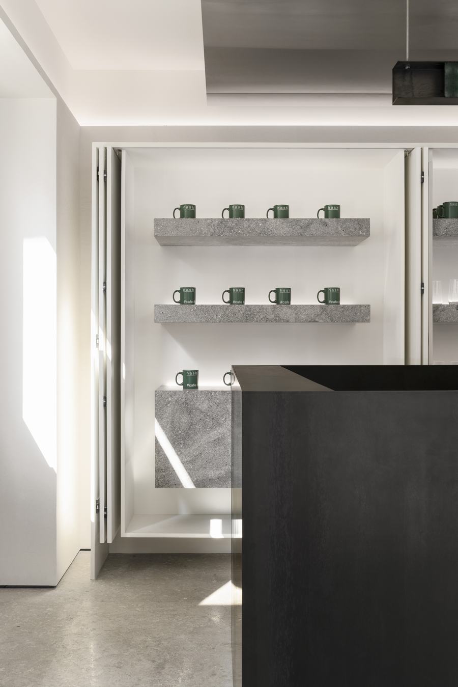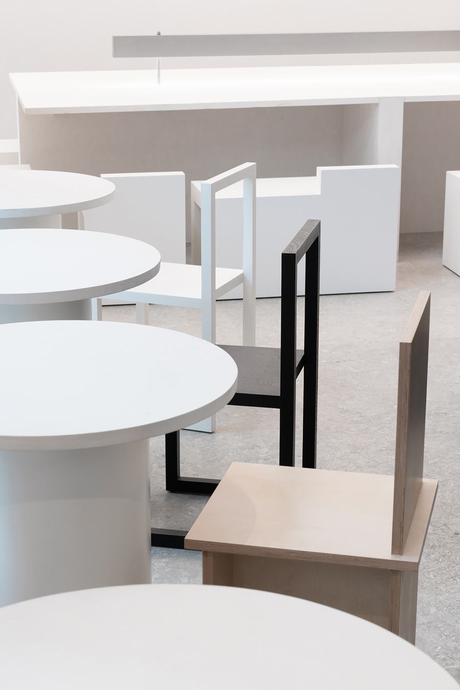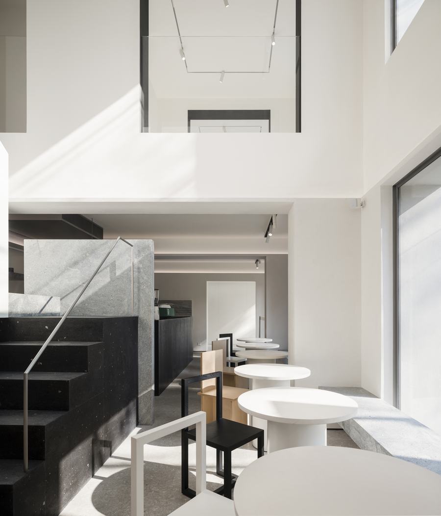 客人完全进入建筑后,可以看到建筑的尽头。三组强化的“孔”构成了主要的空间序列。孔的边缘与外部的梯形风格相对应,并使用装饰性的薄边来消除梁的重量感。在空间末端的开放空间中放置了一个由白色砂岩制成的大桌子,人们可以围绕这张桌子进行各种活动。凳子设计有下背,使它们能够在需要时完全存储在桌子下(内部空间设计)。改造保留了原建筑的楼梯作为后勤通道。同时,设计团队的目标是在两个水平层之间提供一个视觉上高的空间,这不仅形成了尺度上的差异,也增加了客人从建筑内部可以看到的风景的大小。另外,这个设计还可以应付客人上下楼梯的人流。