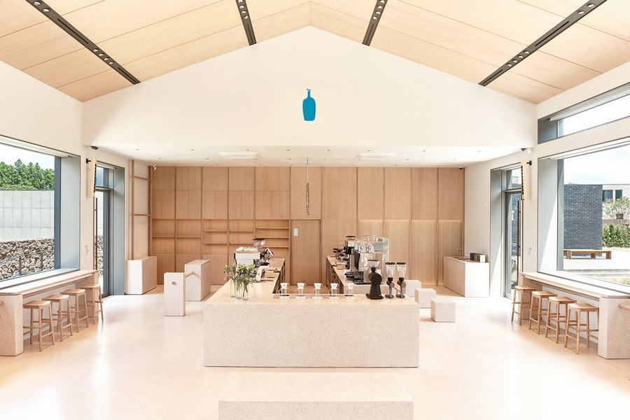 由于当地地域的特殊性便是糅合当地的传统建筑,忠实诠释石头堆砌矮墙自成一格的正廊结构与古代用来替代门铃三根横木,架起和放下几根木头亦分别代表不同情况,此外更是透过济州海滩周围丢弃的玻璃碎片制成的地板材料来表现永续保护环境的精神宗旨,值得注意的还有本回 Blue Bottle Coffee 还携手济州岛当地餐厅打造独家咖啡、糕点和商品,有兴趣的朋友们不妨举步前往探店。