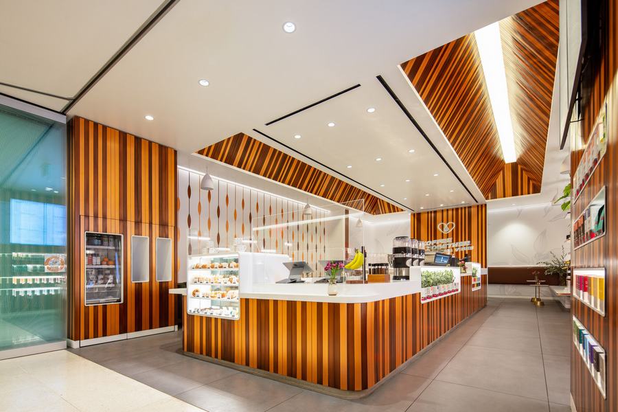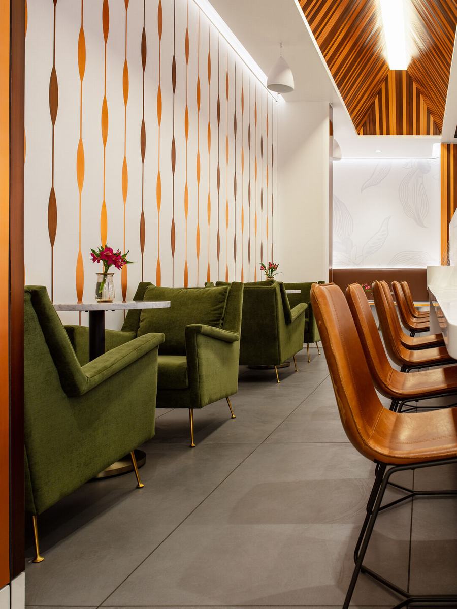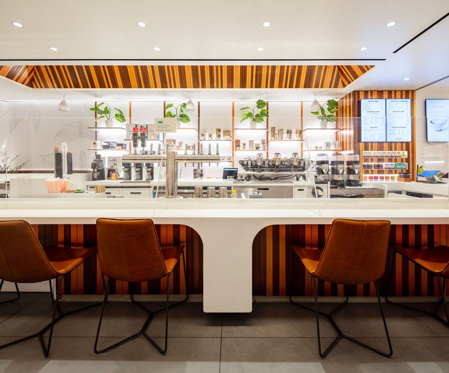 入口处的一系列侧面堆叠玻璃板在广阔的购物中心和私密的咖啡馆之间实现了无缝过渡。 在开放感的映衬下,雕刻的可丽耐图形和咖啡植物的大尺寸印刷提醒客人他们在从农场到杯子的旅程中所扮演的角色。