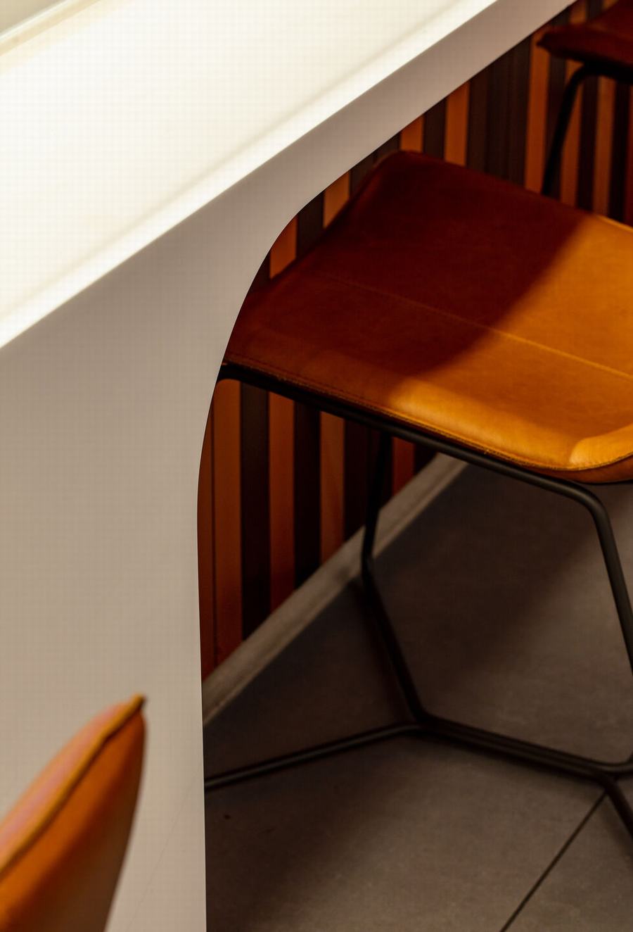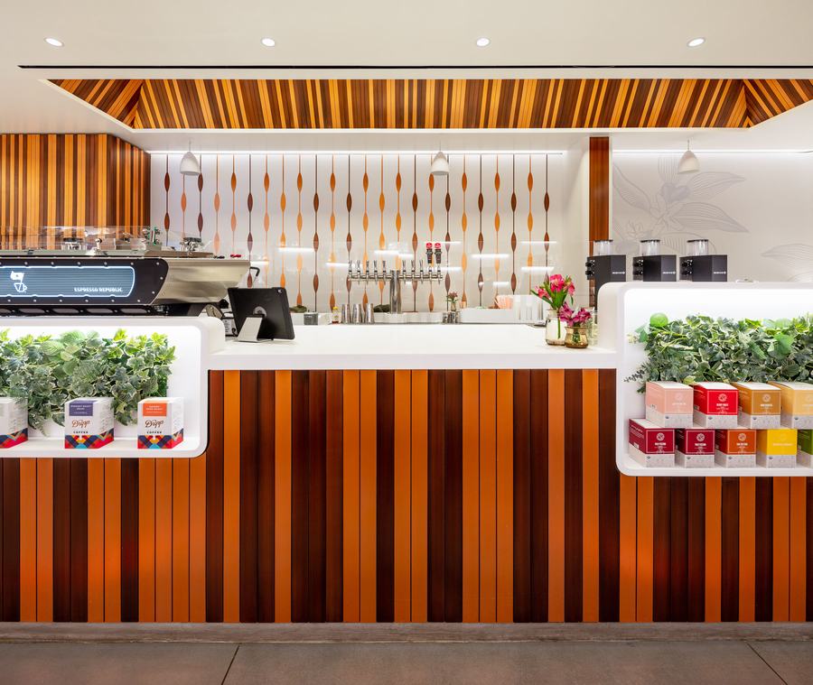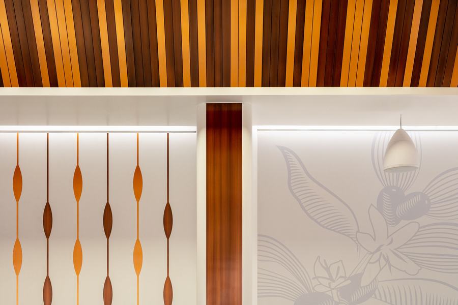 咖啡厅的布局和形式从字面上和比喻上展示了咖啡和茶的制作。由 CNC 雕刻的可丽耐制成的入口以超大的咖啡植物雕刻为特色,并以手工拉丝铜丝带为特色。