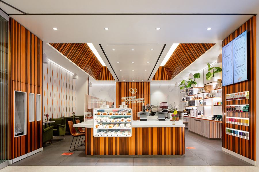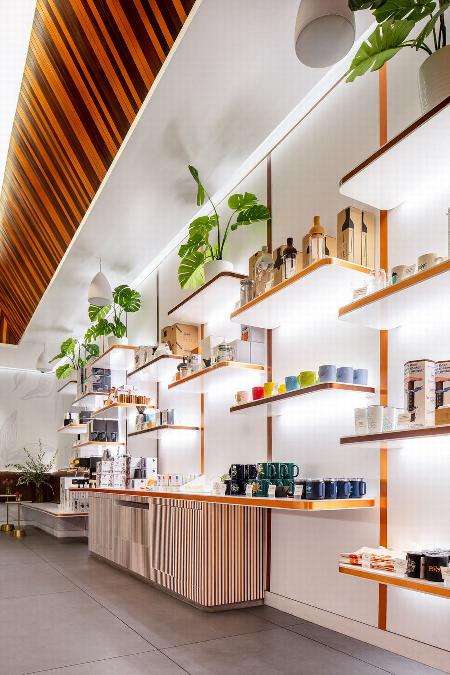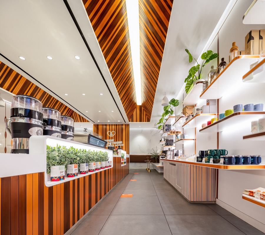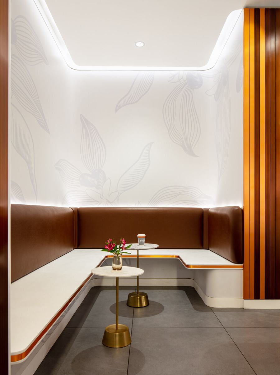 这个概念的核心是一个 U 形咖啡吧,上面覆盖着手工拉丝和古铜色板条,并在豪华购物中心的背景下自豪地展示。在咖啡吧的两侧设置开放式座位区,让客人和路人可以一览无余地看到咖啡师在行动。