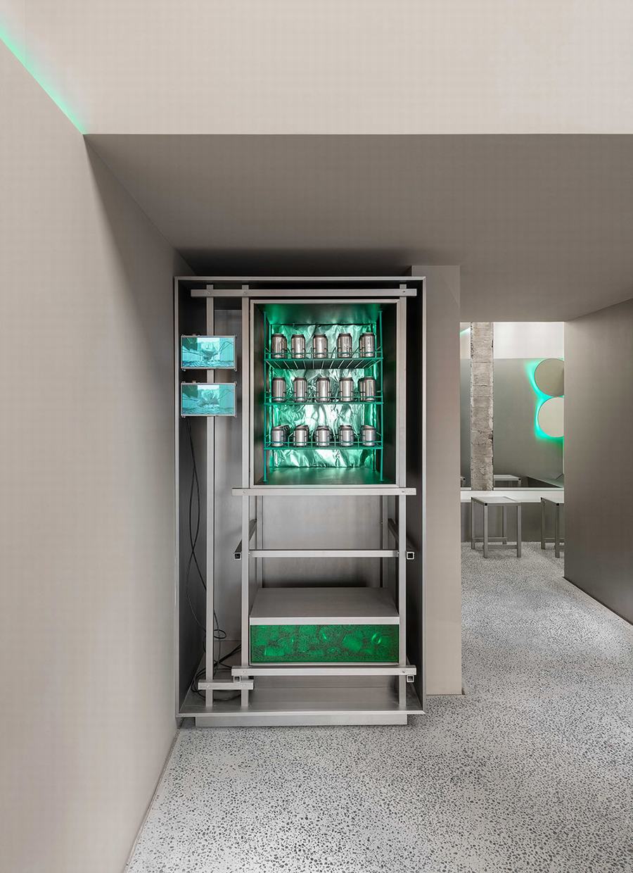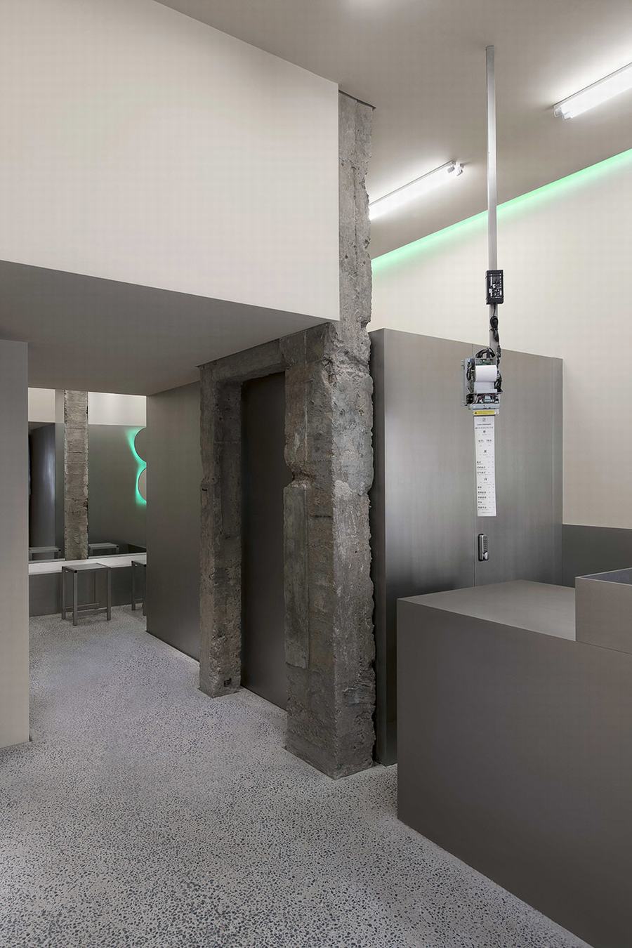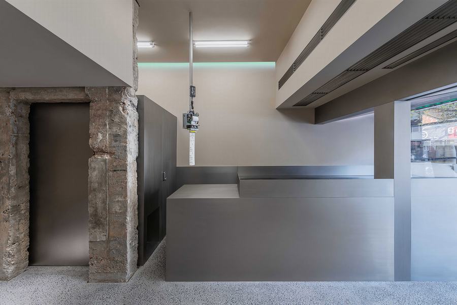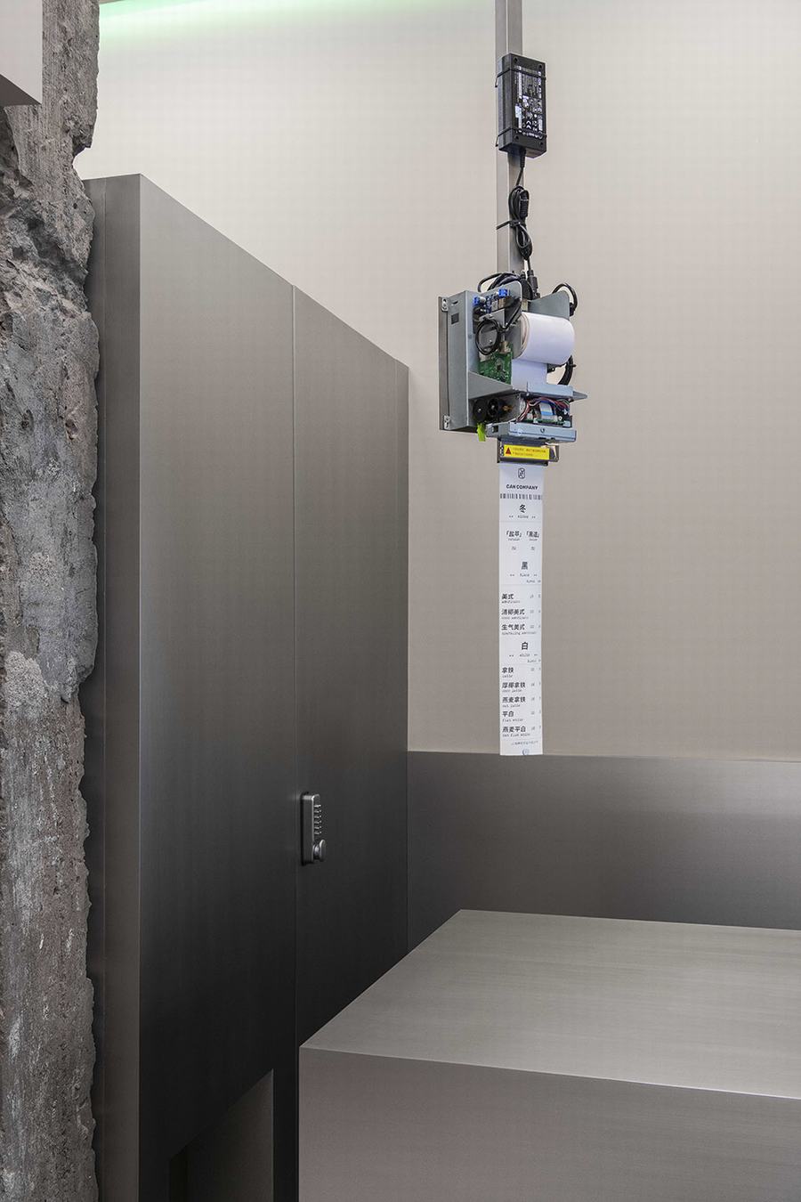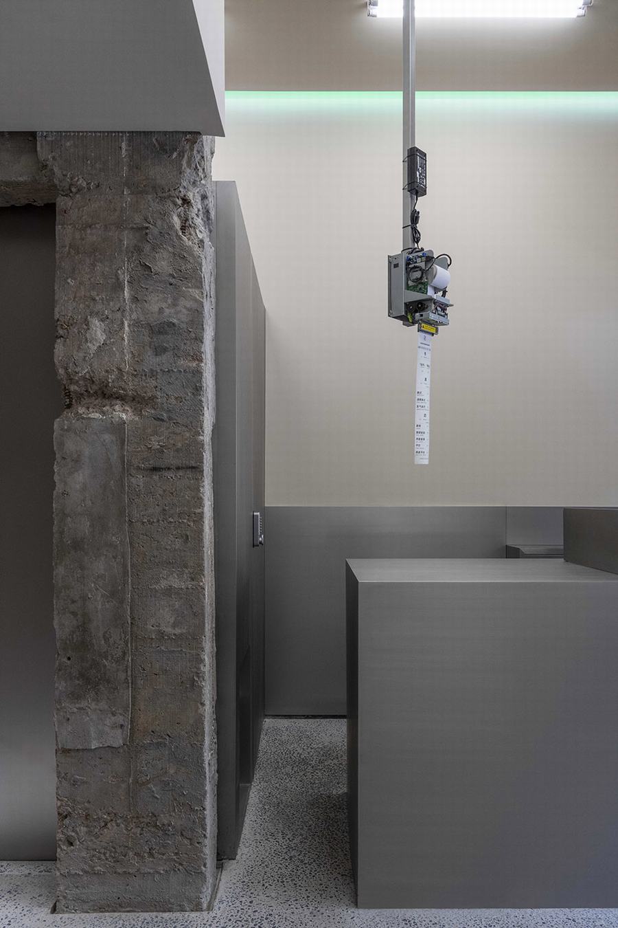 前后区域之间的走廊自然地过渡了空间块之间的挤压,在社区建筑之间形成了“小巷”的形式。物质的碰撞在这个空间里达到了亲密的状态。在这样的“城市巷子”里,顾客可以感受到熟悉的市场感。设计师以便利店的售票机为灵感,将取单机作为整体空间设计的重点,将旧的印钞机拆解重组,将机器内部的工作结构暴露出来,回归机器的原始状态。因此,消费主义的陷阱就产生了。穿梭在城市中的人们回到了他们最自然的生活状态。