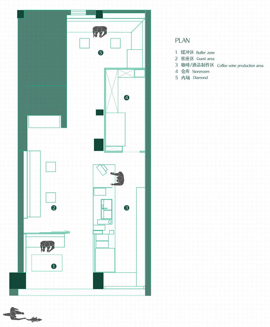在室内空间的设计上,采用宏观的体量堆叠分析来区分三个功能区。如今,快节奏已成为城市的代名词,而CAN COFFEE则能抓住年轻人的当下。此外,“CAN COFFEE”可以让顾客不假思索地买到一杯咖啡,就像在便利店买一罐可乐一样。在入口的右侧,我们将煮咖啡的吧台铺开,一方面方便外卖顾客和外卖骑手快速取餐,另一方面又能在不相互干扰的情况下将他们与店内顾客区分开来。