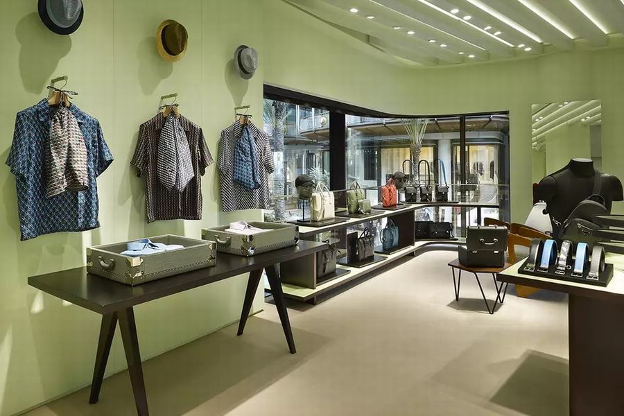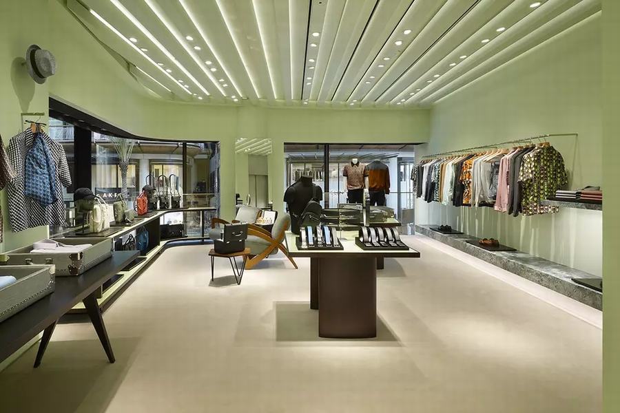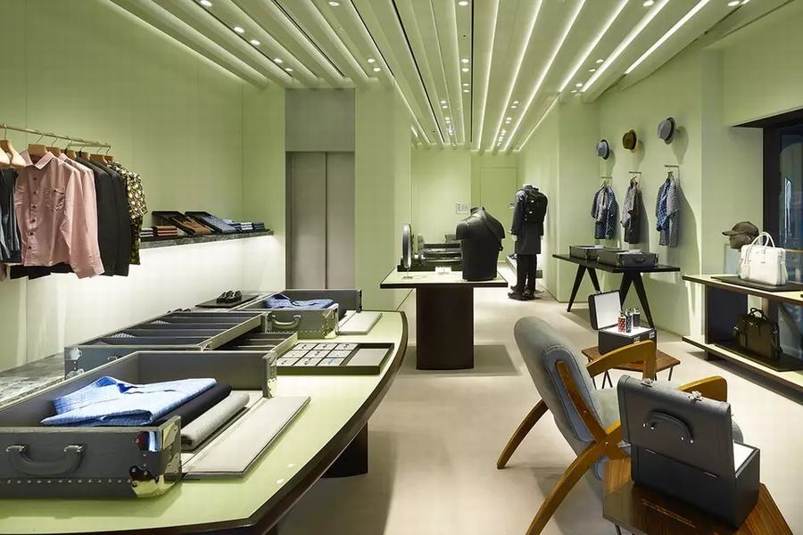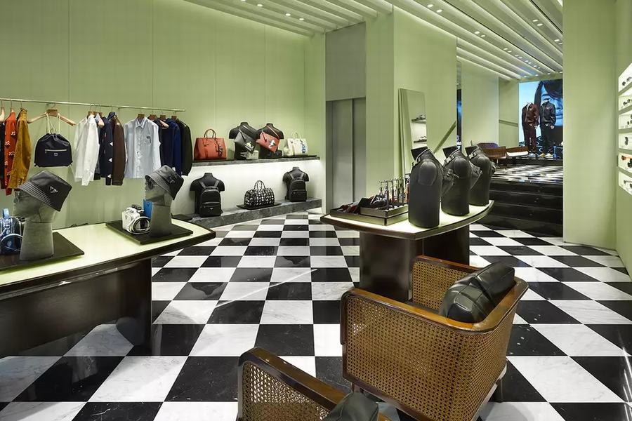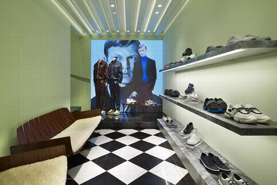 普拉达的新男装店有两层楼,面积约175平方米。从街上可以通过玻璃立面看到商店,因为内部拥有一个开放的平面图。柔和的绿色墙壁和绿色的Aver大理石台面与黑白相间的大理石地板相辅相成,而天花板则是现代主义的设计。