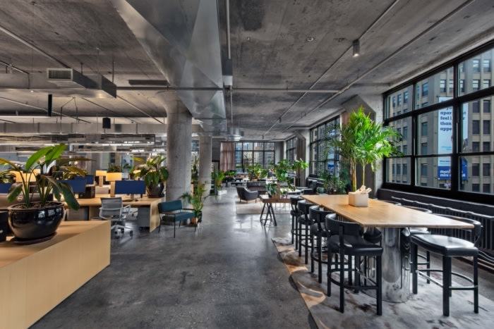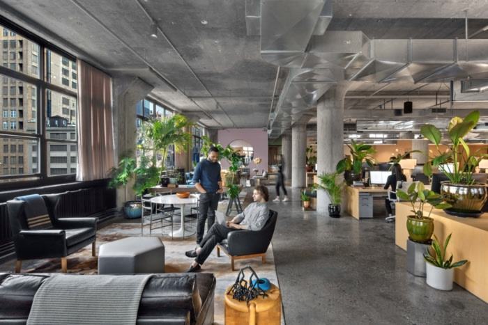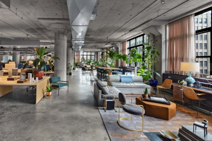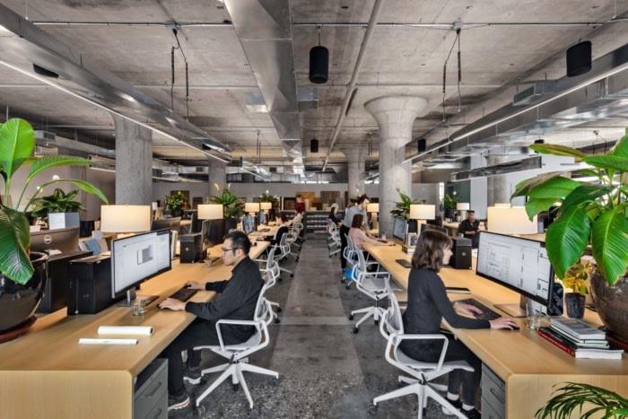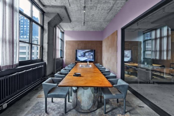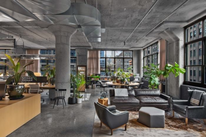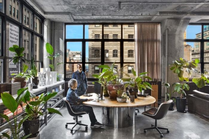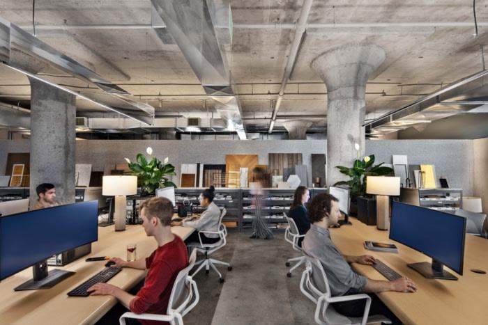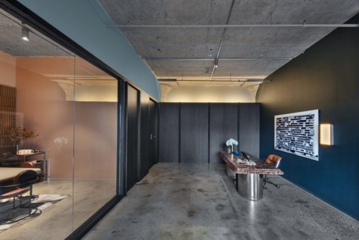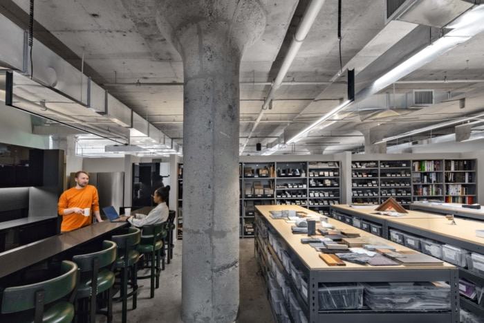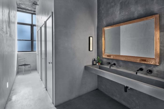 空间被拆回其基本的建筑外壳。精美的20世纪30年代的结构包括柱子、墙壁和天花板都经过了深度喷砂处理,以展现现有的原始混凝土的自然和淳朴之美。混凝土地板全部被抛光到高光泽。20世纪上半叶的混凝土骨料通常是从当地河床中提取的,包括完整的鹅卵石和天然砾石,而不是今天的机械碎石。矛盾的是,结果远比残酷更温暖和自然。9根蘑菇柱组成的回归未来的多柱体主导了构成工作室中心的12个方形柱槽。
