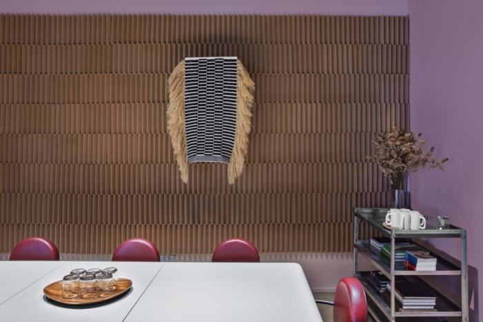 家具具有明显的住宅特色,包括古董、定制室内装潢、定制案例商品、定制生丝地毯、彩色生皮、抛光不锈钢、实心灰和彩色大理石。我们的空间充满了绿色植物、收集的材料、原型、物体和细节,这些细节来自我们的项目、我们的流浪和我们的激情。