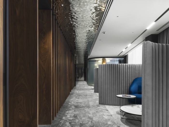 桥的象征是在mkb私人银行标志的下面,给人信心和安心,也在接待柜台成型。入口处是一座连接客户和企业的桥梁的比喻,顶层的桥梁似乎漂浮在空中,给人一种自由和轻盈的感觉。所有房间:大堂、会议室和办公室都以品牌的主题——自然和可控的元素结合在一起。波浪的扭曲、弯曲、彩虹色的架子隔断用运动填充了静态空间——资金流动、事件、生活本身。