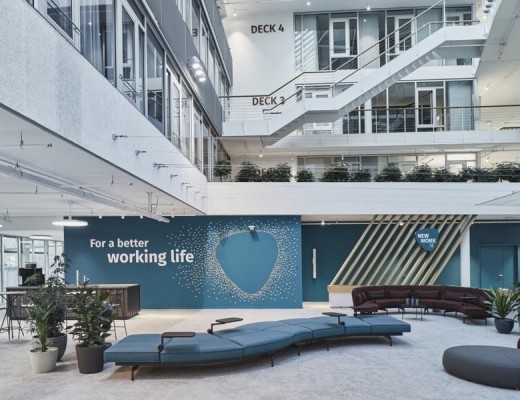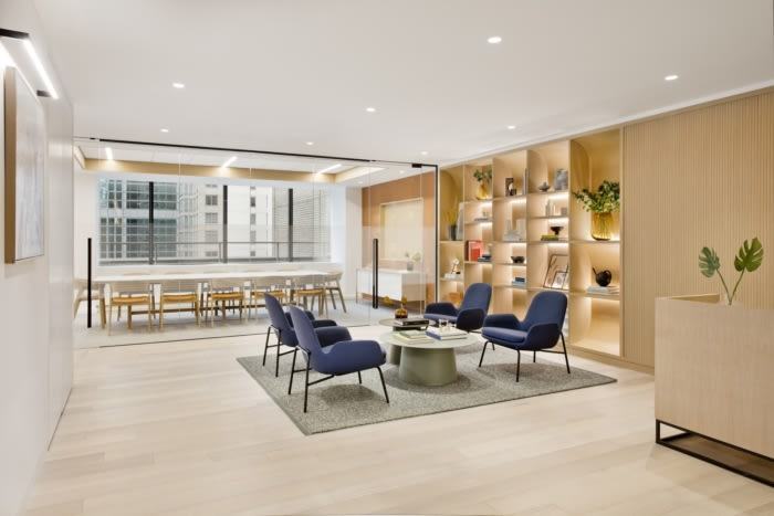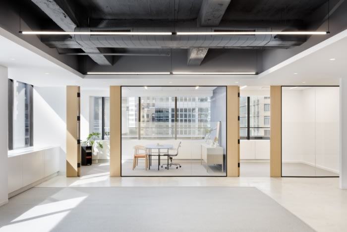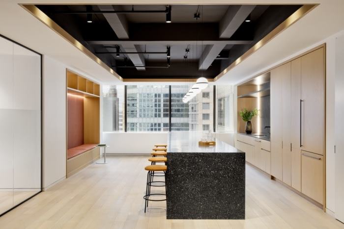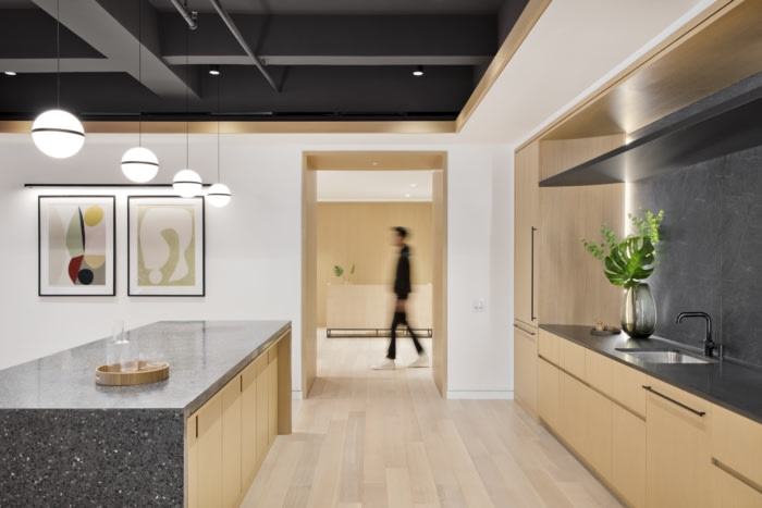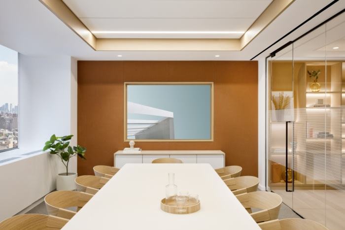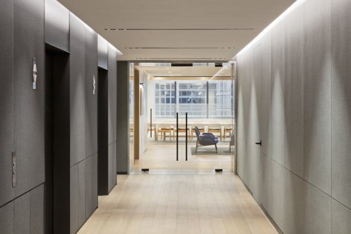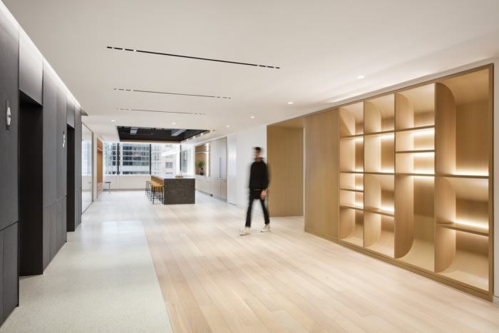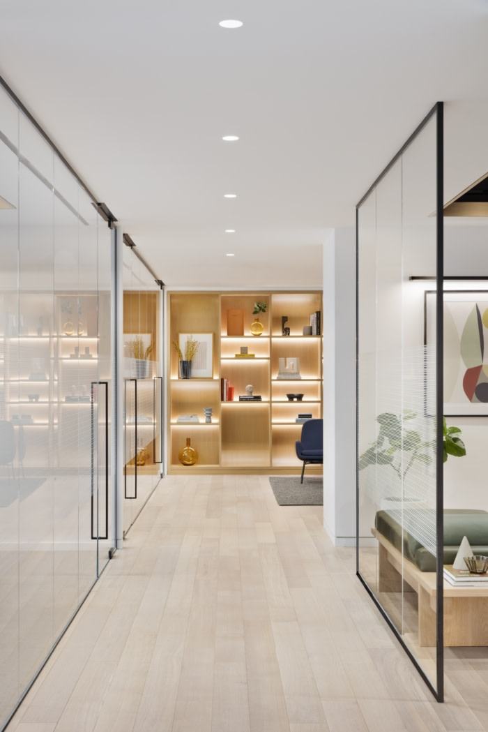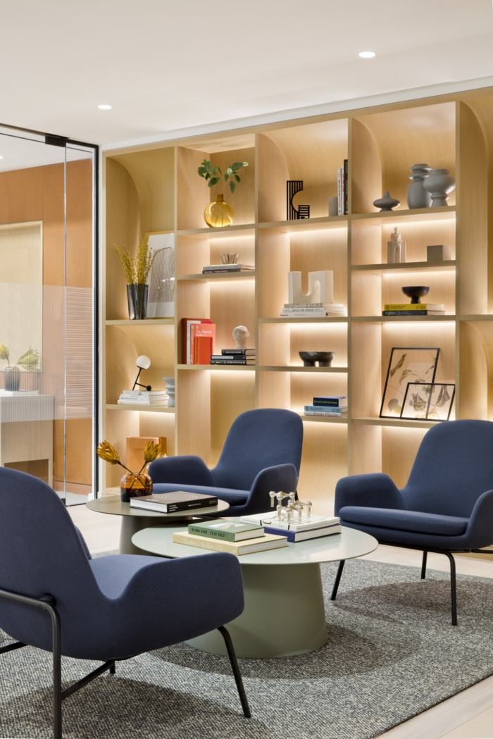 该地块最初由两座独立的建筑组成,因此,“两层”之间的连接区创造了低梁高度和明显的楼层差异的挑战性时刻。套房墙壁装饰有大型定制白橡木木制品搁架,采用弧形形式和集成照明,以防止低天花板高度影响设计,同时打开空间并为租户和访客创建品牌入口。