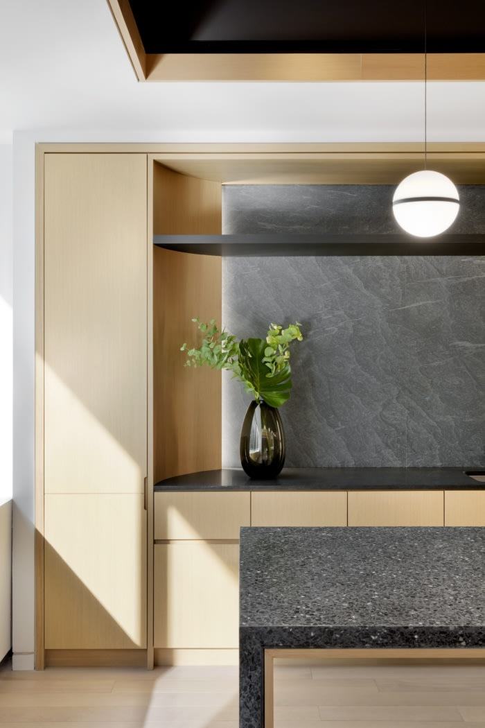 除了店面的木制品货架和定制的线性薄膜外,我们还将对弯曲特征的诠释引入了食品储藏室。这一次,将形状转向一侧,让形式与空间功能一起工作,同时也突出了备用的侧光细节。该团队还在这些区域露出了天花板,在后挡板和台面上也可以看到深色强调色,构成了更温暖的好客般的调色板。