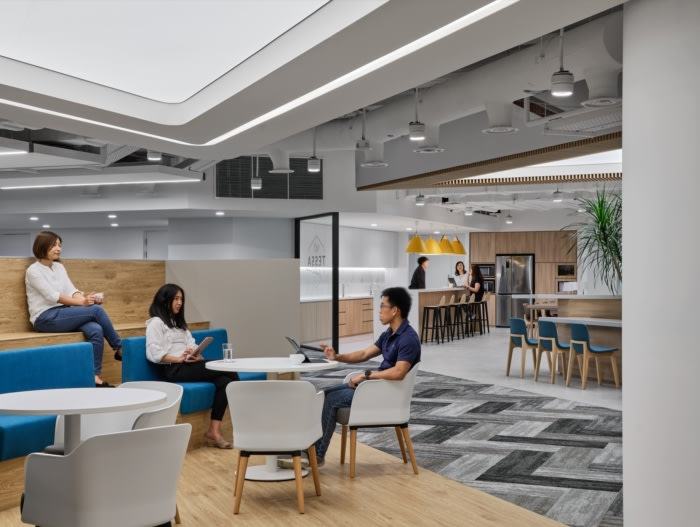 为了解决这个问题,建筑师在建筑的核心部分设计了一个人工天窗,并在天花板上设置了一层照明膜,以暗示自然光源。在这个空间中,中央广场被引入作为社区社交平台,提供了一系列的设施,如小酒馆咖啡馆、头脑风暴实验室、会议设施、图书馆和协作豆荚,员工可以在这里相互交流和联系。