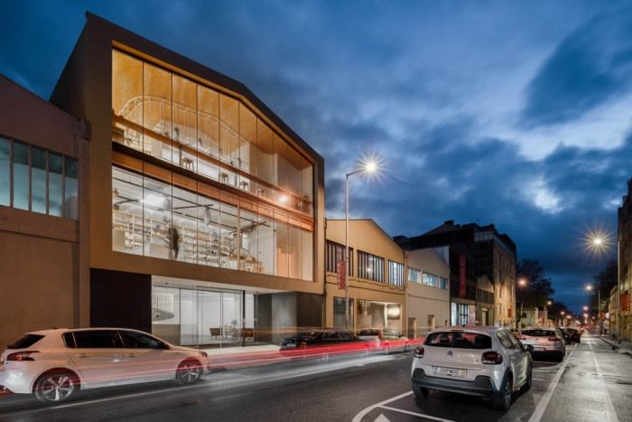 另一个基本问题是确保所有空间都有充足的自然光。根据法律限制定义的立面形状,我们将其设计为完全玻璃化。紧邻立面,我们在二楼找到了照相馆,在三楼找到了餐厅。通过这种方式,我们保证了与主干道的强烈视觉关系,为公司的日常生活赋予了风景效果。照相馆利用北极光,这是它提供的功能类型的最佳光线,因为被天空反射,提供低对比度照明,白天保持相对稳定。