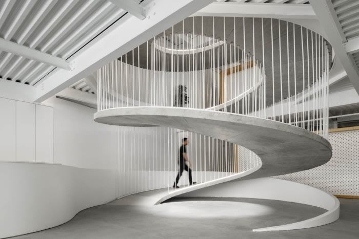 在后立面,向西,我们打开了一系列玻璃窗,加强了全天自然光的存在。为了保证楼层之间流动和自然的关系,我们设计了一个具有强烈雕塑特征的混凝土螺旋,将三层相互连接起来,并通过它的存在来表征整个空间。在顶部,天窗照亮了三层楼,露出支撑坡道的往复杆结构,这是工程师优雅地提出的。