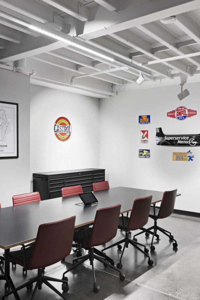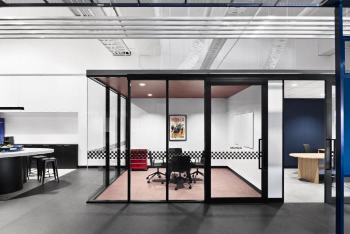 钢管的速度线环绕天花板,作为环绕主工作站区域的导航设备。分组讨论室的分层座位体现了体育场看台的精神。封装主工作站的钢网笼模仿赛马场围栏。地板由回收的汽车轮胎制成,办公室配备了一个 8 米长的 Albert Park Scalextrics 模型。还有一个“维修区”,看起来像服务车库,用于短期会议空间。