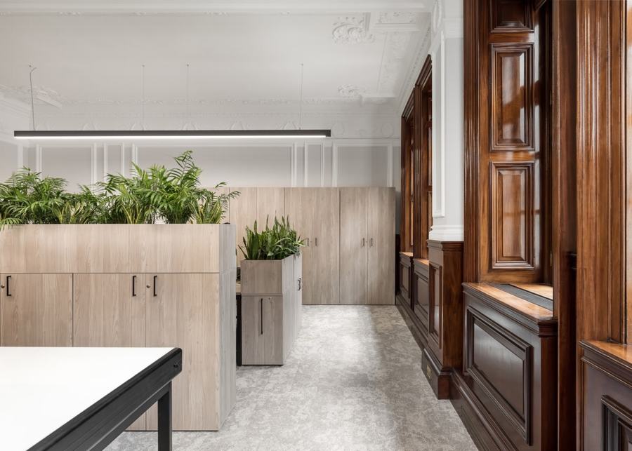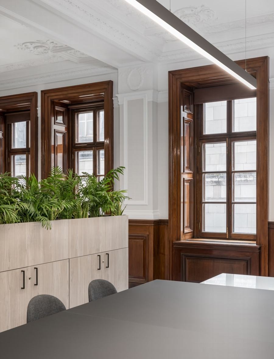 Oktra 与一位遗产顾问合作,确保他们的工作考虑到建筑物的历史建筑,并保留了原有的墙板和皇冠造型,为这个工作空间带来了经典的感觉。设计师从我们客户的业务性质中汲取灵感,并以石材质地为灵感选择了永恒的泥土色调和地毯。通过使用玻璃隔断和种植来划分办公桌区域,Oktra 打开了空间并允许充足的自然光,同时仍然为员工提供工作隐私,并将工作楼层与面向客户的房屋空间前部分开。