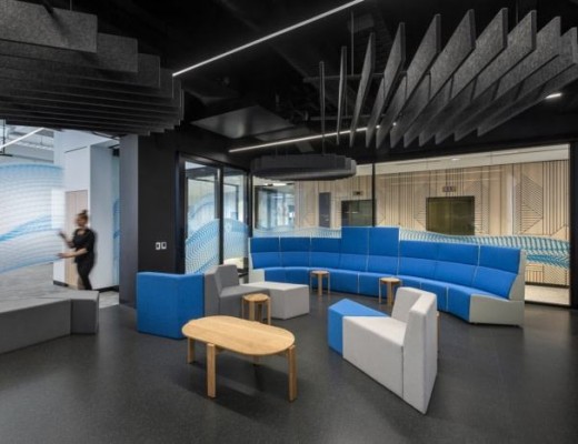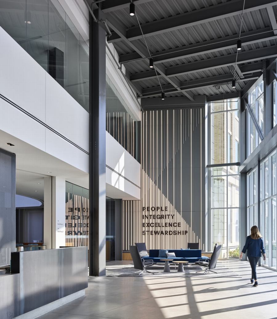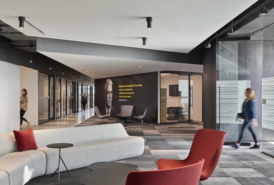 开放式布局使员工能够在日光充足、高度灵活的办公室进行协作。其他空间包括会议室和培训室、礼堂、全方位服务的自助餐厅和咖啡厅。环境图形和室内饰面使用材料和工业色调,以庆祝公司在大型工程项目中所做的工作。大型图标墙、Kiewit 历史时间表和创始人的励志名言点缀着整个空间。