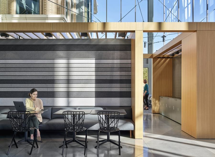 除了创造新的空间效率外,Kiewit 还认识到这个办公项目有机会支持其文化和增长、招聘和保留目标。HOK 与包括开发商 VanTrust 和 JE Dunn Construction 在内的设计建造团队合作,设计了一座新的六层办公楼,并对现有建筑进行了翻修。该团队还重新构想了入门体验,以庆祝 Kiewit 的工艺和文化。该项目包括园区总体规划中未来扩展的灵活性。