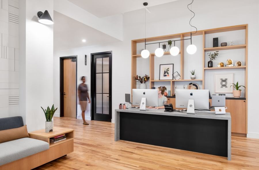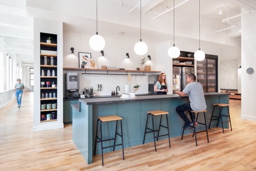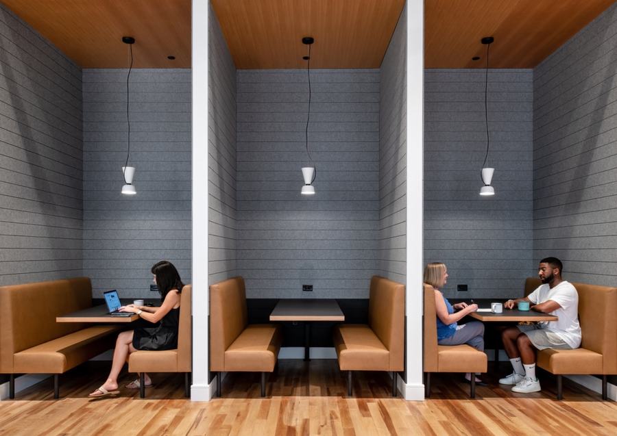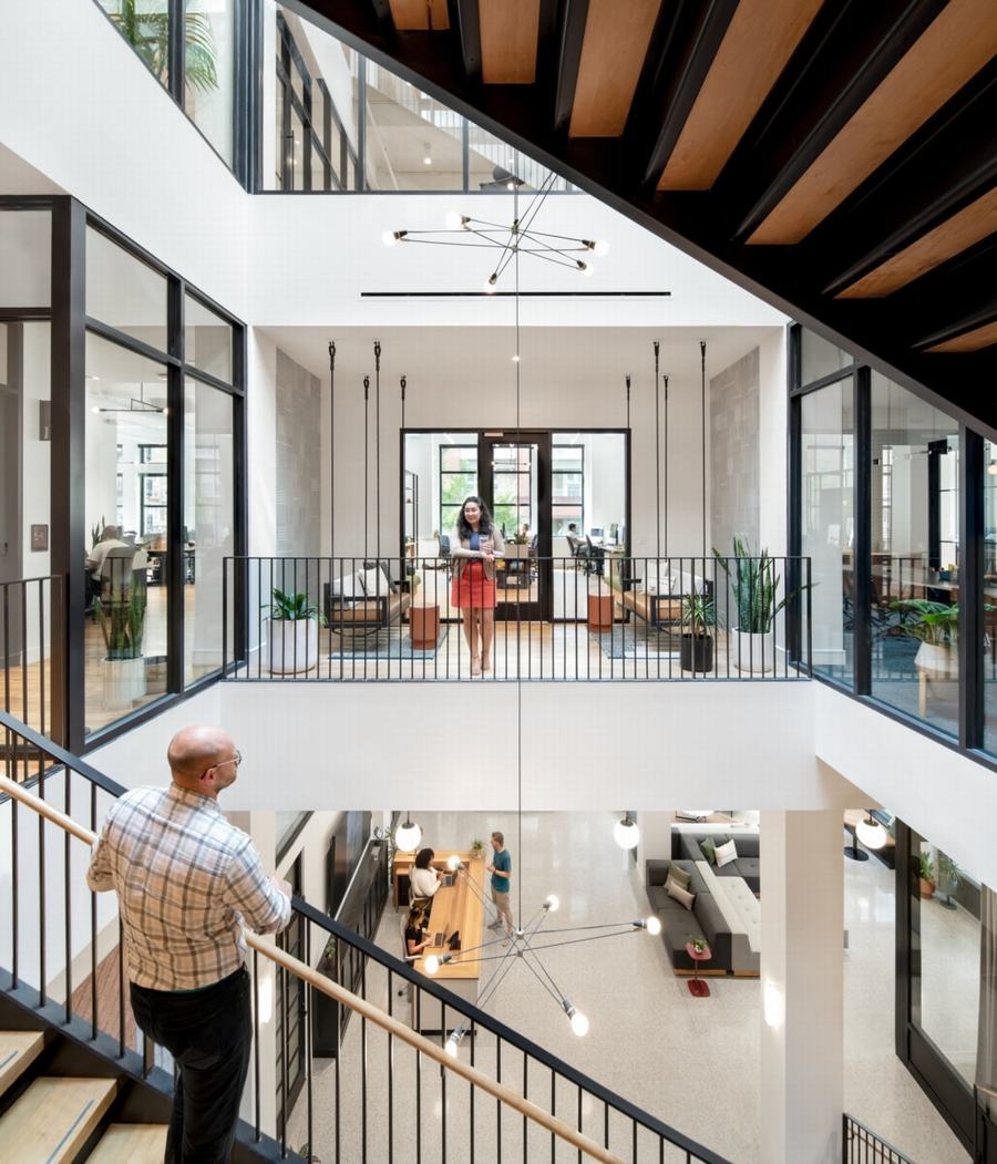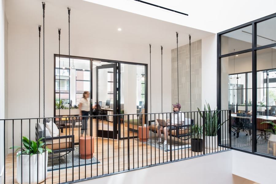 Grow 办公室还具有俏皮且可通过 Instagram 发布的元素,例如内部阳台上的一对“前廊”秋千(从前百货公司的 HVAC 室改建而成的“发现空间”),客人可以从 Assembly 的中庭看到。该空间有效地模仿了户外露台的感觉,并将 Grow 的团队与建筑物内的更大社区联系起来。