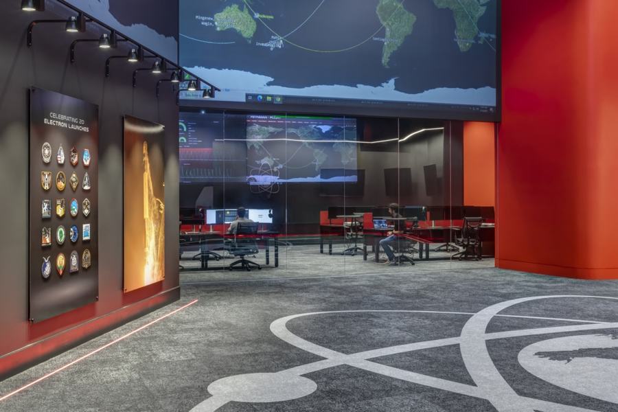 Rocket Lab 总部最独特的特色之一是沉浸式客户体验室,旨在启发和教育 Rocket Lab 的历史、使命和卫星发射观看区。客户体验室以空间为主题,以黑色为主,以红色和白色为主色调。房间内包括一个远程观看现场发射的投影系统、火箭实验室历史的时间表和一个天花板,天花板上装有 450 个灯泡,可复制我们的家乡银河系。