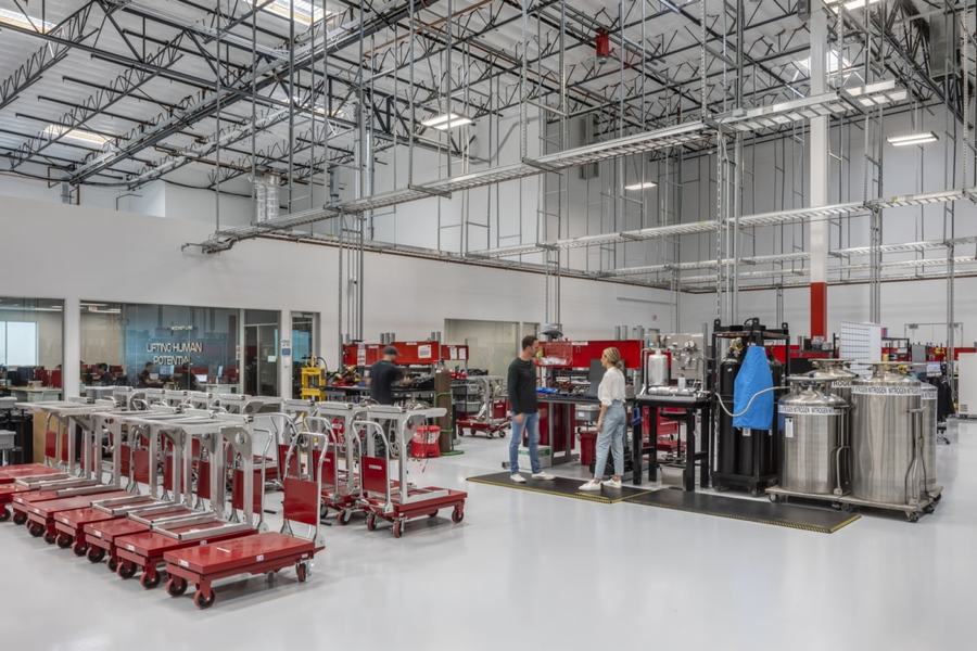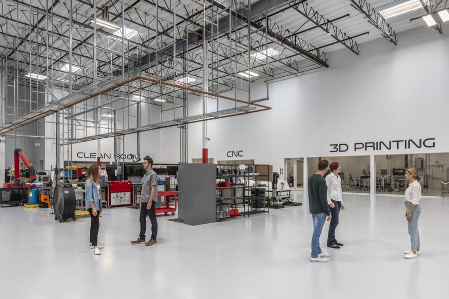 另一个独特的功能是制造车间。作为一个活跃的制造空间,布局需要干净和高效,有专门的 3D 打印区域、洁净室和质量控制,同时仍然允许技术进步的机会。大空间旨在适应当前和未来的技术需求,同时仍提供对生产至关重要的重点区域。