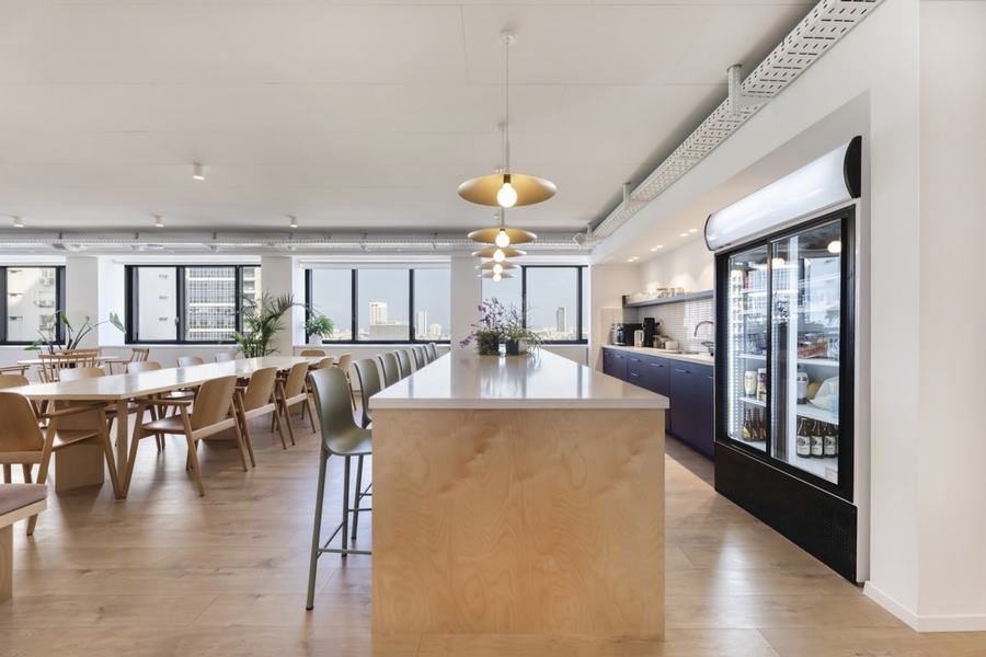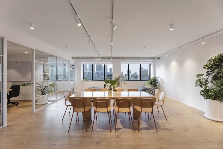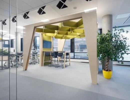 办公室占地 600 平方米,位于市中心一栋办公楼的 11 层。美丽的城市 360° 天际线景观是规划的起点,并构思了一个特殊的布局,其中开放空间由不同的功能划分,如会议室、游乐区等。这样,不同的部门可以保持冷静和安静,同时仍然保持联系。该计划还为空间提供了模块化,并能够在未来放置额外的工作站。这种开放式的布局,加上空间占据了整层楼的事实,使办公室内充满乐趣的圆形流通,环绕着建筑的核心。