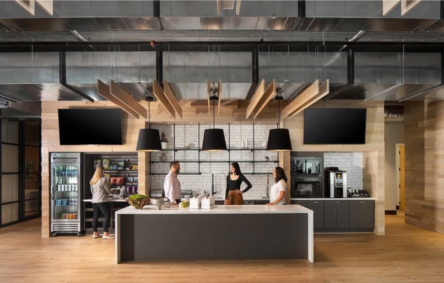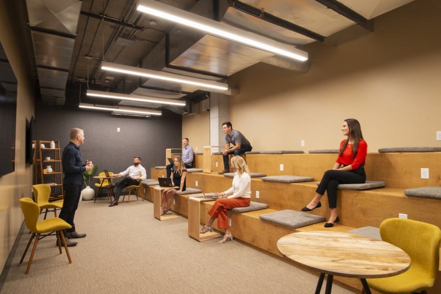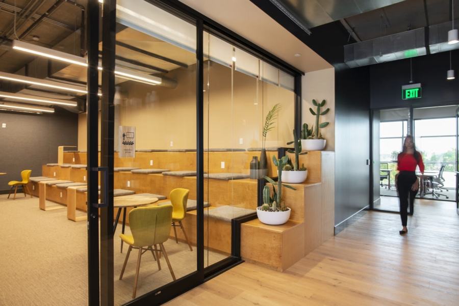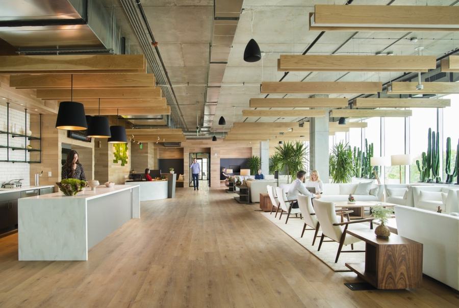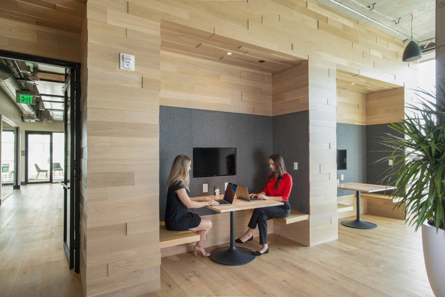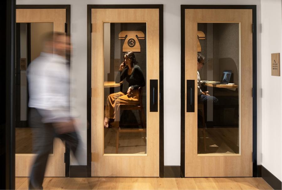 设施丰富的空间包括一个健康室、冥想室、40人培训室、四个电话亭、两个谈话亭、三个会议室和一个软座无桌会议室。播客室为会员提供最先进的现场制作音频和视频设备,房间四周环绕着不规则宽度的白橡木镶板和土色隔音墙毡。咖啡厅对大型软座椅精品休息室开放,该休息室可作为可容纳 125 位客人的下班后活动空间。工作区专为多元化的创业社区而设计。可容纳 225 人的私人办公室满足了对高效舒适工作空间的需求。其他工作区提供 24 张专用办公桌和 16 张共享办公桌。