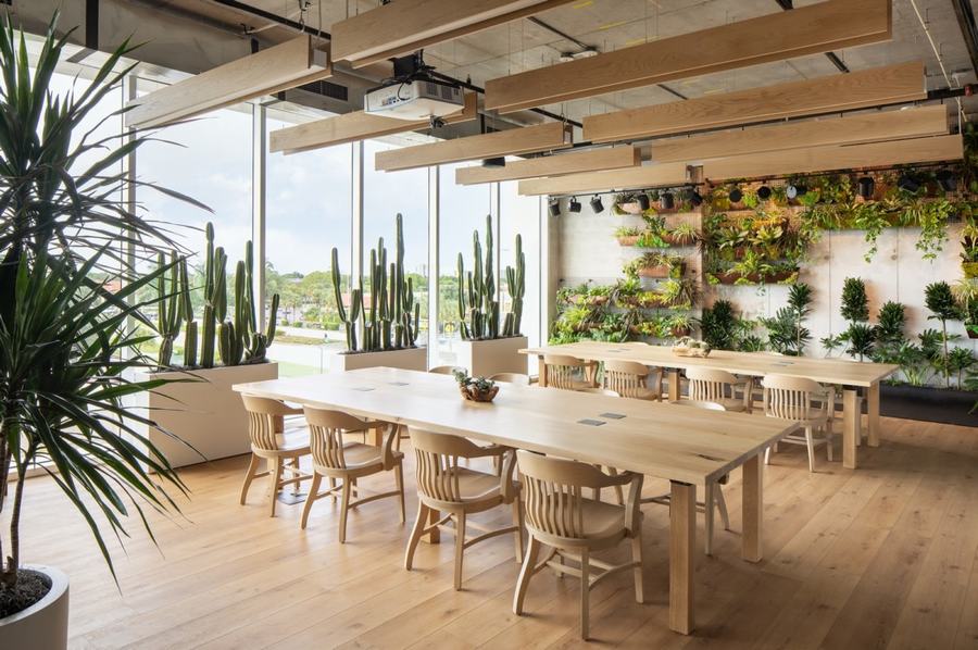 客户的目标是设计一个豪华的办公环境,在一个每个人都喜欢来工作的地方引入户外活动并促进健康和自然。落地玻璃环绕整个建筑周边,为每个办公室带来自然采光,并捕捉沿海天际线的景色。迈阿密屡获殊荣的亲生物设计工作室 Plant the Future 设计了亲生物环境,以促进福祉和与自然的联系。设计包括苔藓艺术墙、垂直生活花园、地板种植和植物桌面艺术作品。