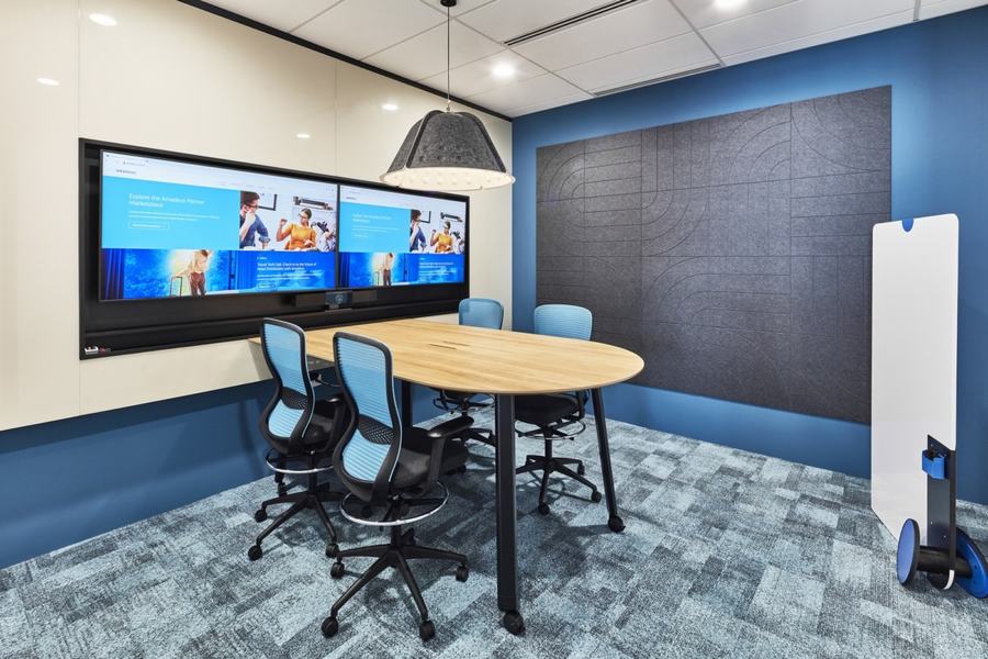 为了进一步引导和帮助人们在他们的新工作场所找到自己的路,我们还实施了房间的颜色编码。Amadeus公司的蓝色为全体会议室增添了生气,而较小的讨论区域则被柔和的绿色所覆盖。同样的调色板反映在装饰墙壁和用于声学控制的挂板上。