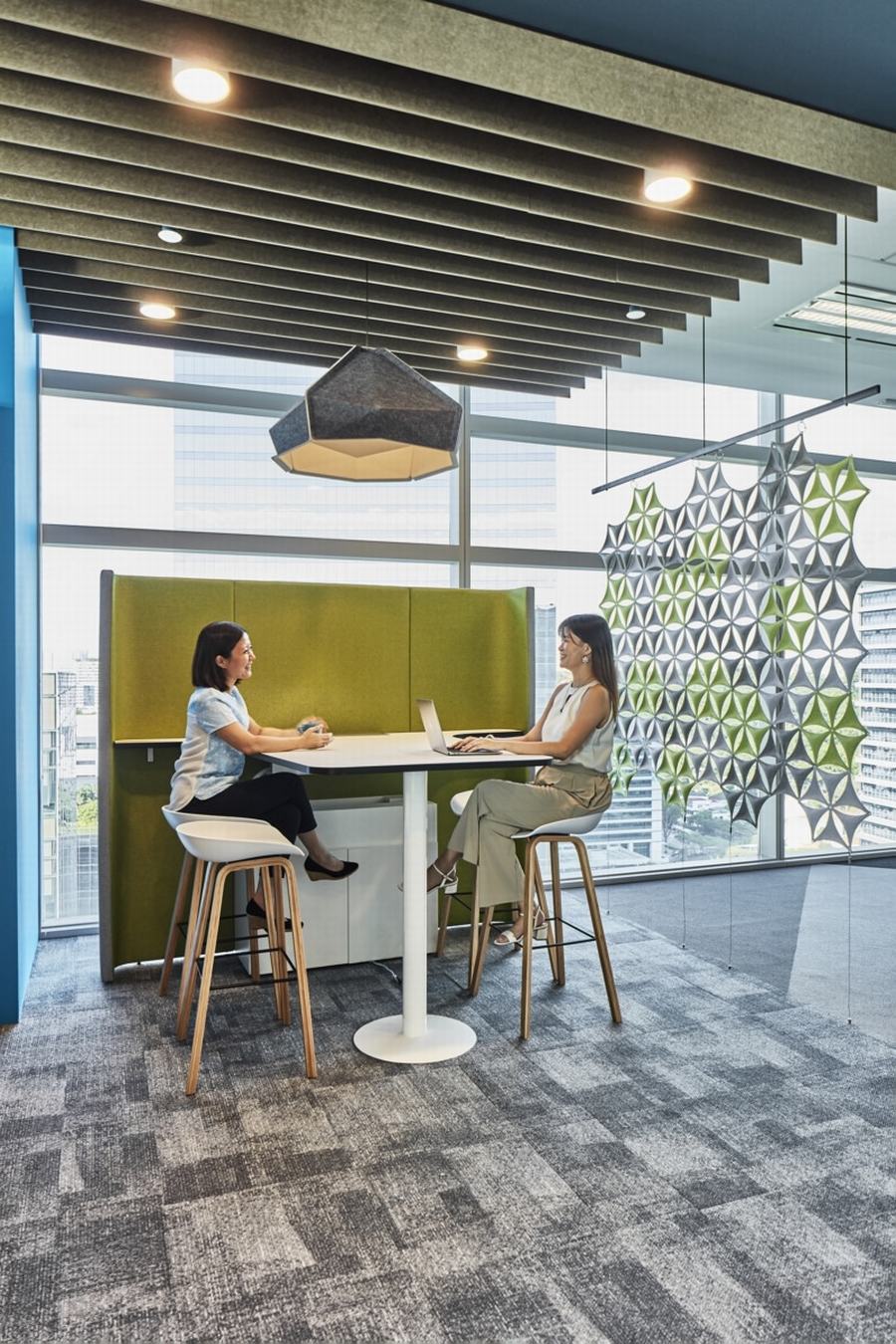 以自然为灵感的元素旨在“将外部引入”,在这个开放概念的工作场所中也具有强烈的特征。在接待区,一道赏心悦目的苔藓墙勾勒出亚太地区的地理轮廓,迎接来访者,而在办公室的其他部分,植物和悬挂的树叶则提供了平静。在可能的情况下,还使用生态认证的家具和装修。