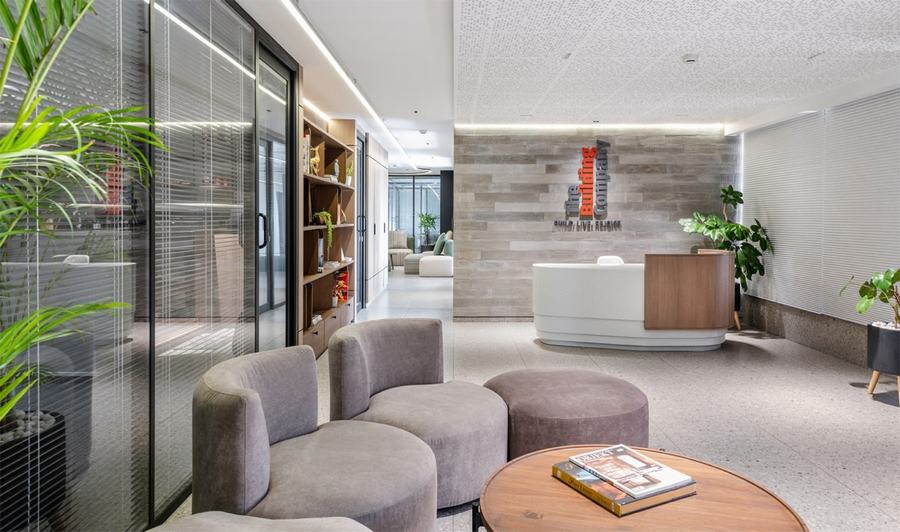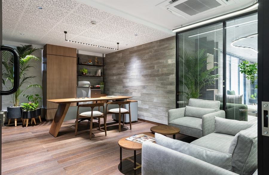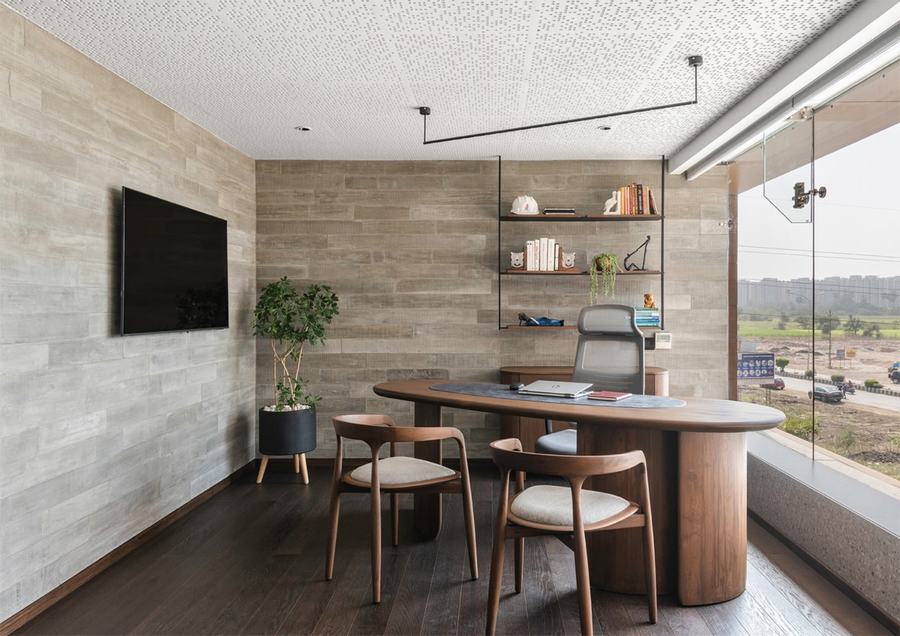 位于苏拉特,一家房地产公司的 3,500 平方英尺楼板的办公景观最近由 ADDA Architects 团队完成。该项目探索了工作文化的未来,旨在通过最简单的设计对话来促进健康和协作。