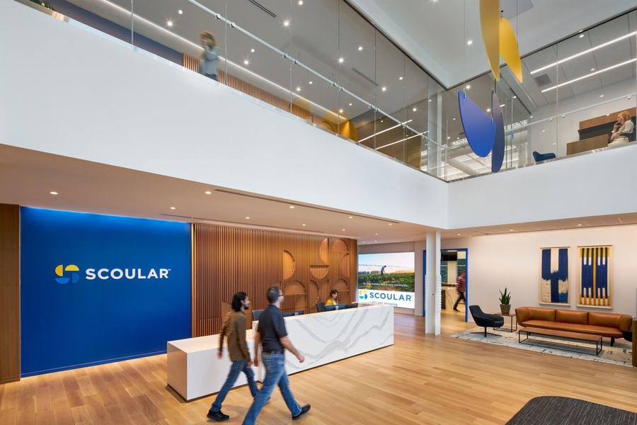 其他设施,如健身中心和用于独处、恢复和隐私的健康室也被纳入,以改善员工体验。Scoular 焕然一新的品牌和黄蓝标志与所选材料无缝融合,确保每个空间都反映了百年农业综合企业的专业和现代身份。一个新的特色楼梯连接第二层和第三层,以增加透明度和员工便利。