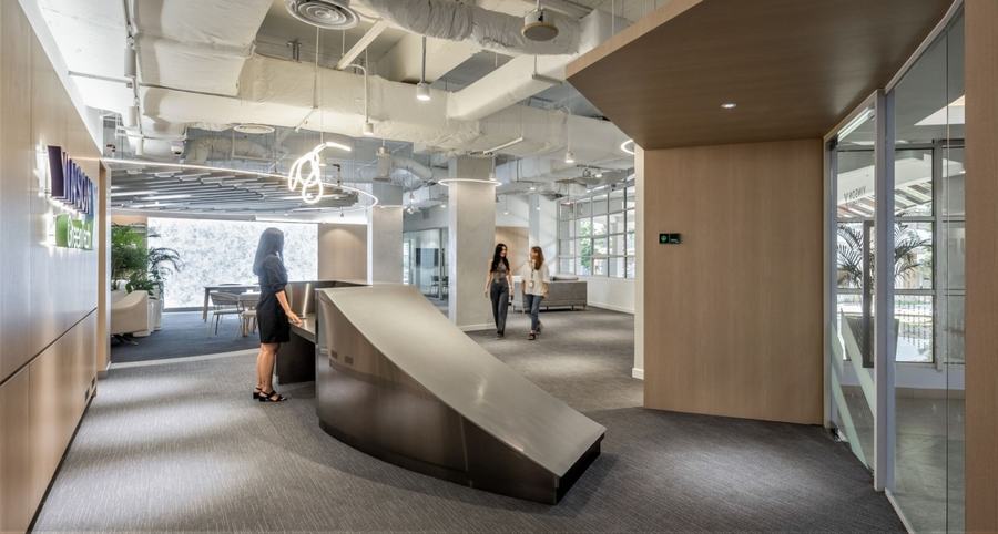 感官曲线的无缝细节,代表自然和有机形式的最好的自然生长。无限的日光和绿色能源通过室内表面溢出,自然地突出了每个部分的工艺。柔和的色彩在工作空间的每个合作区域的应用提供了一种独特的平静体验感。最终的设计意图是带出企业的DNA形象,促进可持续能源和舒适的工作环境。