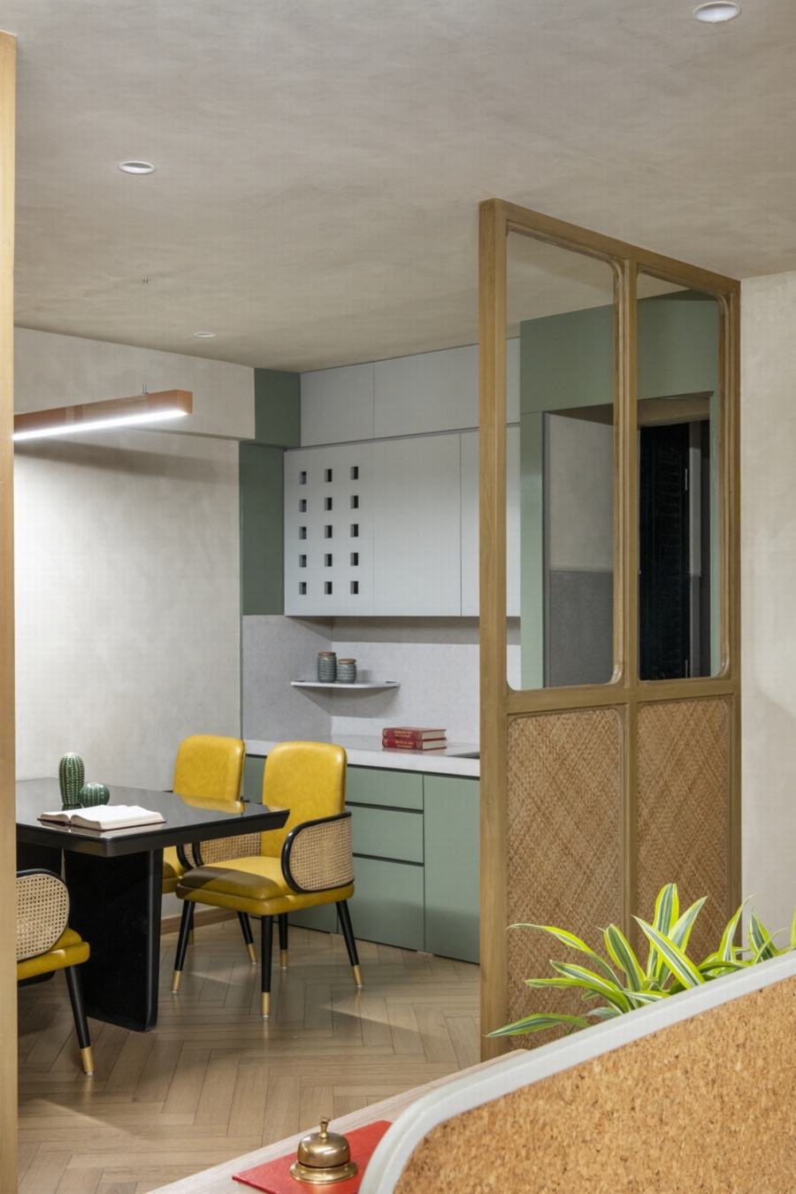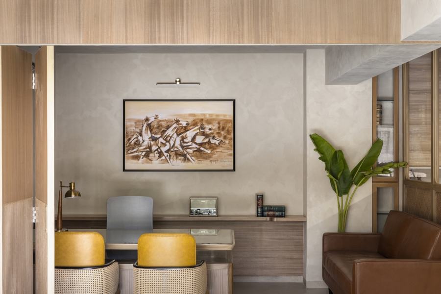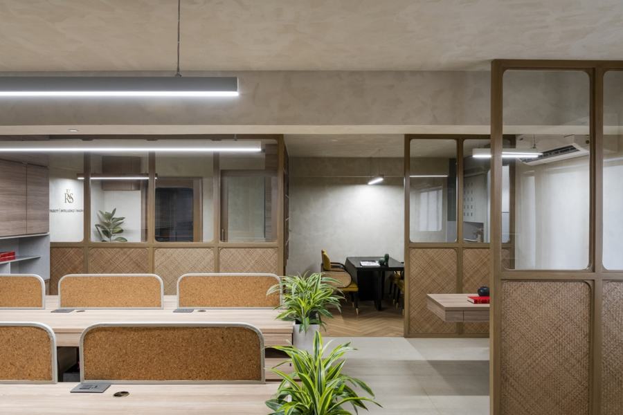 我们设计这个工作空间的方法是一种必要性和生态意识。在设计中使用了藤条、木材和绿色植物,给办公室带来了温暖和温馨的感觉,同时也环保。空间也提供了一种自然的美学,促进了平静和宁静的感觉。
