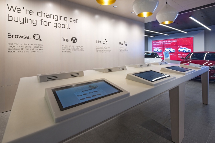 概念,通过创意机构Dalziel及战俘设计特点45数字内容的屏幕和两浏览表11互动21英寸的触摸屏平板电脑。这些让客户可以浏览现代范围内独立,书籍现场’你驾驶’测试驱动器,甚至在五分钟内进行购买。独特的Westfield是这些触摸屏表坐落在商店的外面。将创建一个24小时店面品牌专区,让客户看展示车,浏览和购买即使商店关门了,购物中心是开放的,比如如果去Westfield的电影院或酒吧在晚上。由于现场体验中心,有20辆车可供’你驾驶’测试驱动器。位于购物中心的停车场房你开车接送中心已设计感觉像一个诱人的休息室,从概念演变为响应高于预期的空间使用。它作为一个扩展的商店和作为一个测试的驱动中心和服务中心,在现有的现代车主可以放弃他们的车,然后店或看电影,而它正在工作。