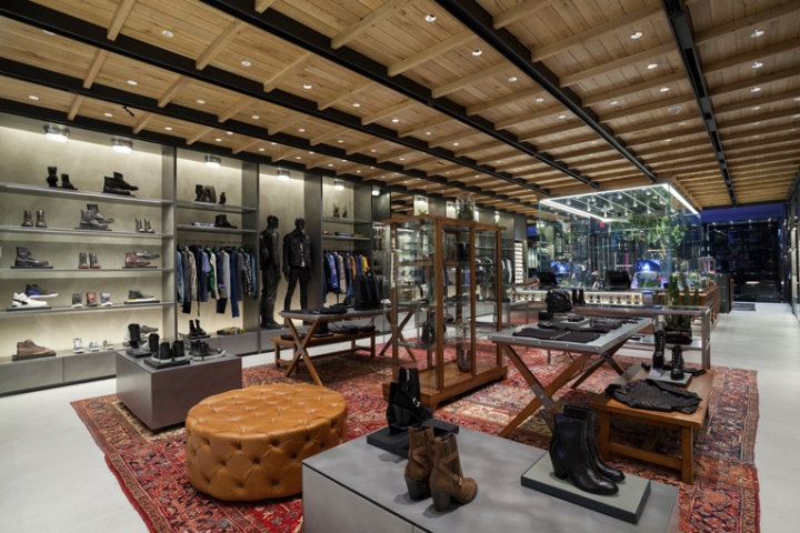在商店的尽头,一个葡萄酒窖启发的部分介绍了柴油的令人垂涎的牛仔系列。设计是折衷的,说的最少,配对东方地毯与抛光混凝土地板和天花板覆盖的对比轻木材。这家商店是精心挑选的家具件,但部分的背景是由高清晰度屏幕由英国声音和艺术的集体领域的数字作品。由于购物者都沉浸在一种诱人的生活方式的体验,会让他们逗留更长一点的处所。