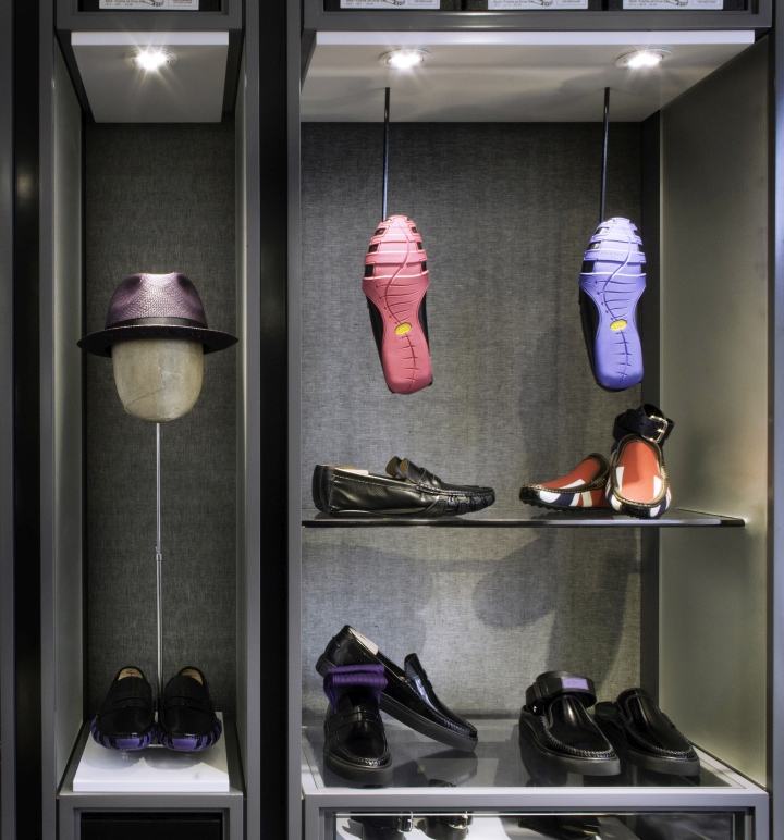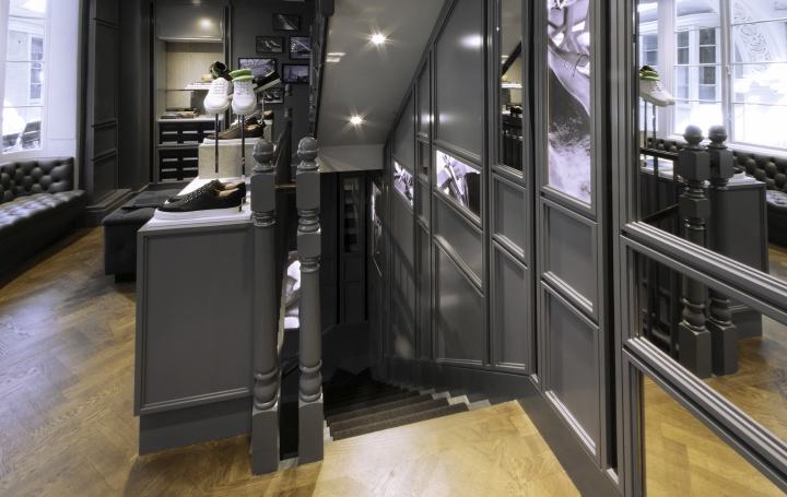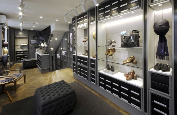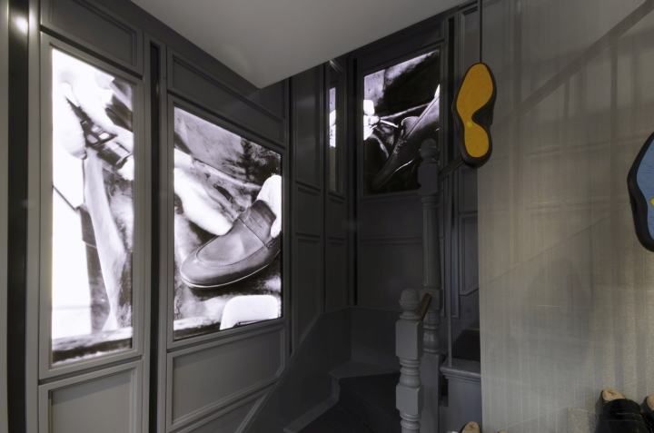 磨砂镜用于墙体夹具两侧商品拿起各种颜色,创建一个光线柔和的辉光。该品牌的标志性图案蚀刻在苍鹭的明镜,象征着英国人的智慧。浮冰块有助于使重点商品在Windows提供光效,受安慰哈利独特的鞋底。楼梯有背光图形时刻展示品牌的文化遗产,其工艺与创新。