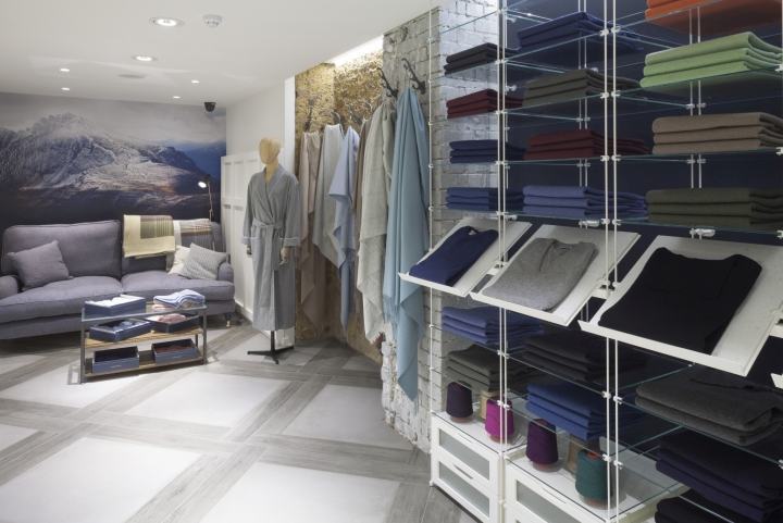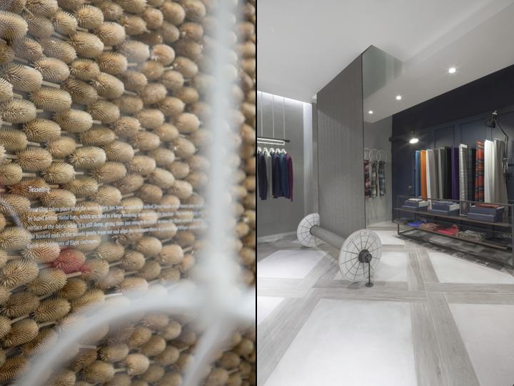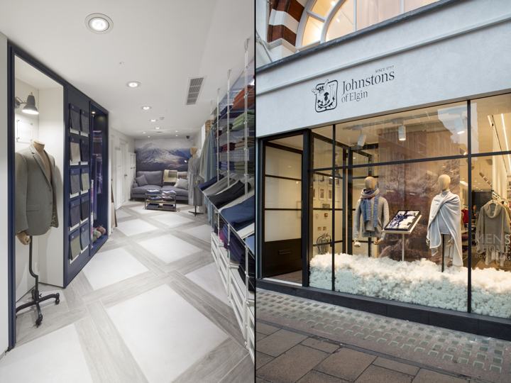 在设计商店我们看的过程中如何布制成,和抽象这一想法告知建筑室内空间,创建链接到工厂和公司的苏格兰传统,与元件的设计和视觉营销巧妙地借鉴埃尔金制造过程以及交流他们的声誉产生最好的羊绒约翰斯顿。