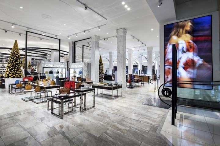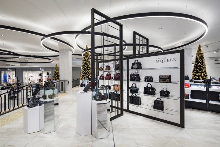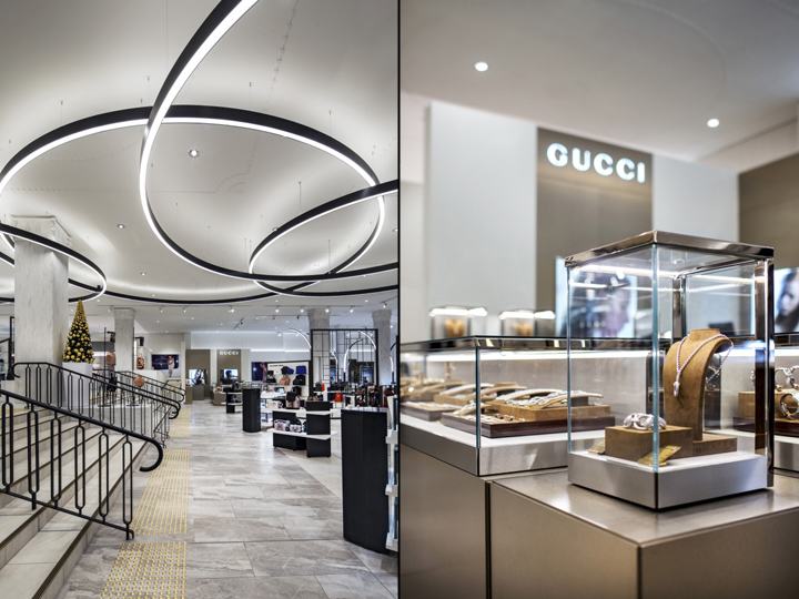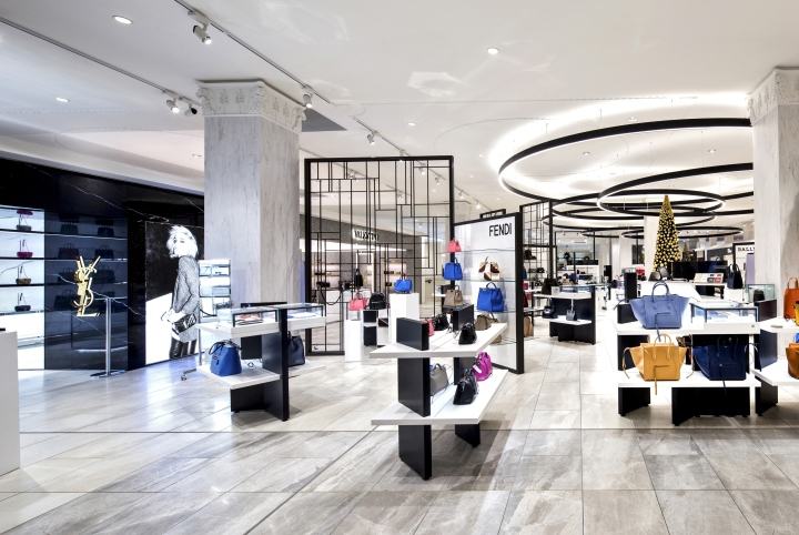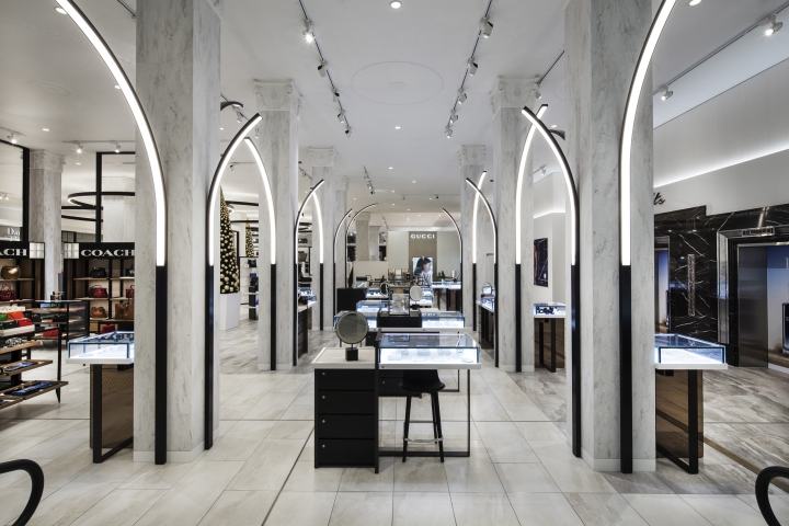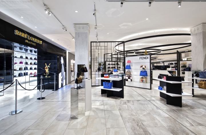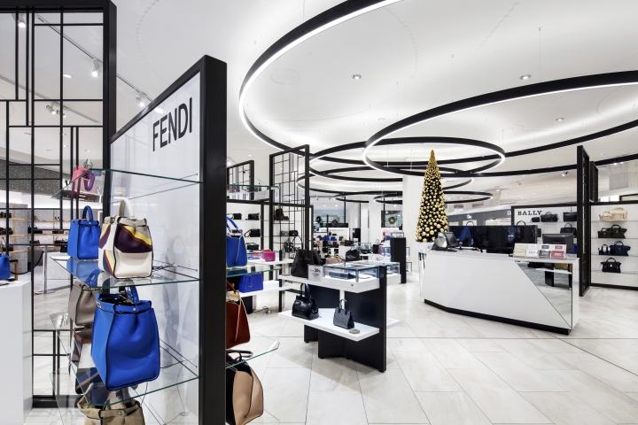 提供手袋、饰品、珠宝、配件大厅中央空间主机集群的多品牌,被一系列的精品店的优惠效果关键品牌店,有定制的灯具来定义不同的区域。