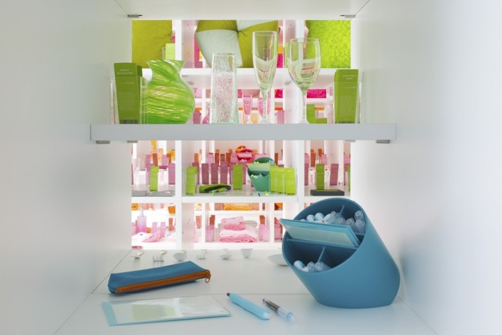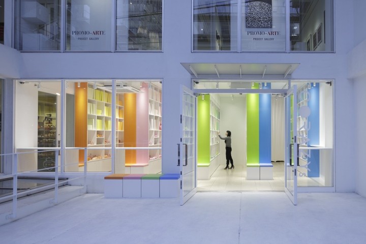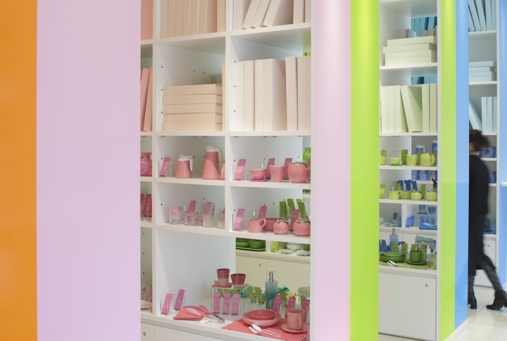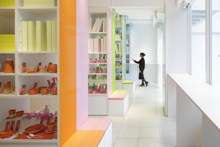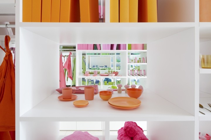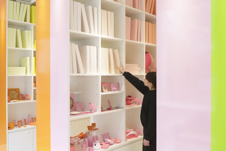 书架上摆放着大量的彩色书籍,像一个色彩库。虽然从外部看时,店内显得色彩丰富,但在橙色、粉色、绿色和蓝色的大架子上,空间被大架子上的空间划分,创造了四种颜色的小世界。站在粉红色的架子上,架子上的书架上装满了不同深浅的书,而下面则是不同种类的家居用品,在不同的材料中有不同的颜色。每一个项目都有一个特殊的故事,比如在图书馆里拿一本小说。此外,四种颜色的世界是通过在前面和后面的货架分层颜色的开放,享受在全方位的颜色空间。