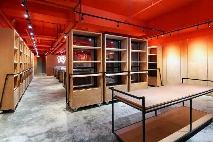 取代传统的屋顶漆成白色,橘红色的天花板在裸露的配合为混凝土地板产生的未经处理的周围。在橙色天空的色调和饱和度的可视化增加了一点点温暖。因此,它平衡的敏感性和未完成的胶合板手推车与黑色金属的触感在这个空间。