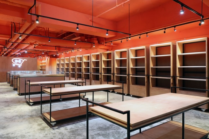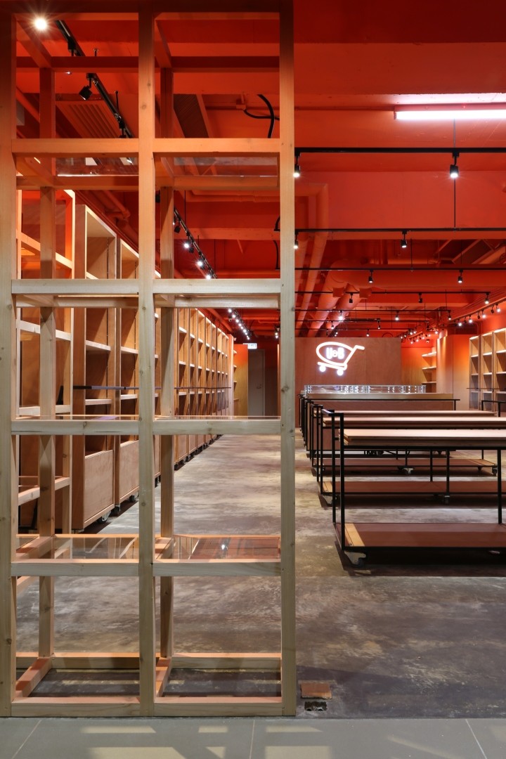 这个项目的概念是把当地的食品杂货品牌,u,变成一个高度灵活的和混合的空间,用单一的材料和颜色来实现客户的关注。它重新定义了如何度过一个低预算的建立有系统的创新设计。鉴于美国的品牌标志是一个购物车,他们的企业颜色是橙色,内部环境包含所有这些元素,以贡献其独特性。