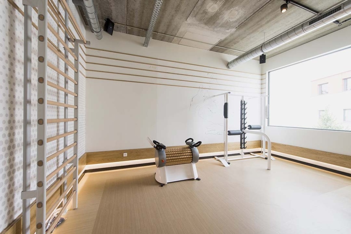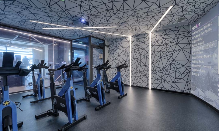 在走廊上,灵感来自运动轨道的明亮线条从天花板上暂停,标志着主要交通工具。气氛正在蓄意激励和激励。在运动员在氧气条件下训练的“高空”房间中,几何图案让人联想到现代化的冰晶,散发着非常冷的照明条件的动态光线。
