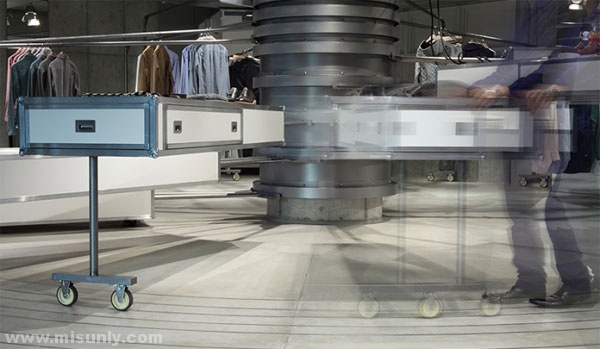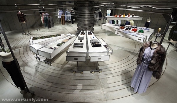这家店的内部被设计来唤起我们的一种时尚/零售实验室的想法 – 原材料钢材和混凝土饰面与优雅的白色层压木案件平衡。主要计划是建立在一个大型现有结构柱。而不是列处理纯属障碍物,我们通过一个旋转木马,在所有作品中协同工作的想法受到启发。一个巨大的钢铁机制 – 绰号“怪物” – 被定制并制作成适合列左右,并担任主播的所有主要零售功能(并允许客户最大限度地发挥内部足迹)。