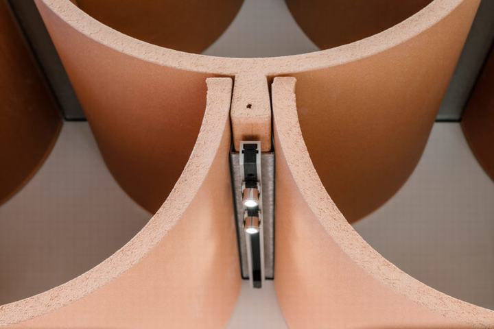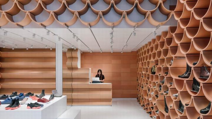 乍看之下,新的Camper商店是一个模块化巧思的练习:一组紧密组装的半圆形原始陶瓷,宽度足以适合成人鞋,创造一个万花筒般的架子壁纸。每个定制金属接头内部都隐藏着一个小型聚光灯,照亮了鞋类样品。